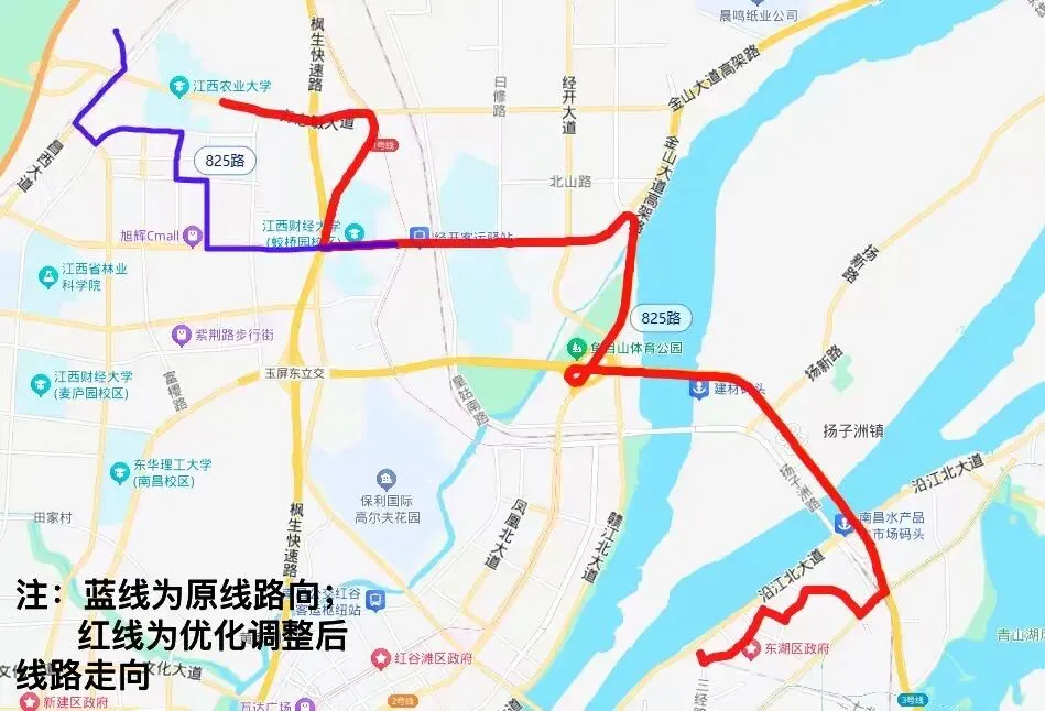 1.调整后线路走向:小蓝公交总站—富山二路—金沙大道—富山大道—斗柏路—莲西路—复兴大道—迎宾中大道—迎宾北大道—抚河南路—抚河中路—抚河北路—沿江中大道—阳明路—塘子河;