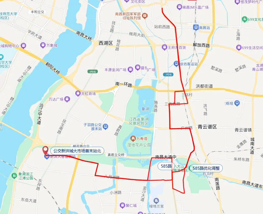 1.调整后线路走向:公交新洪城大市场首末站北—芳湖路—东新一路—八月湖路—金沙大道—南昌大道—迎宾北大道—岱山东路—子真路—青云谱路—青云谱路北路—广州路—迎宾北大道—三店西路—京山新街—何坊西路—井冈山大道—八一大道—井冈山大道—三店西路—迎宾北大道—广州路—青云谱路北路—青云谱路—定山路—迎宾北大道—焕章路—八月湖路—东新一路—芳湖路—公交新洪城大市场首末站北;