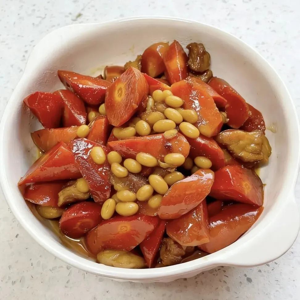 白米饭、胡萝卜黄豆烧肉、花菜炒虾仁、菠菜猪肝肉丝蛋汤