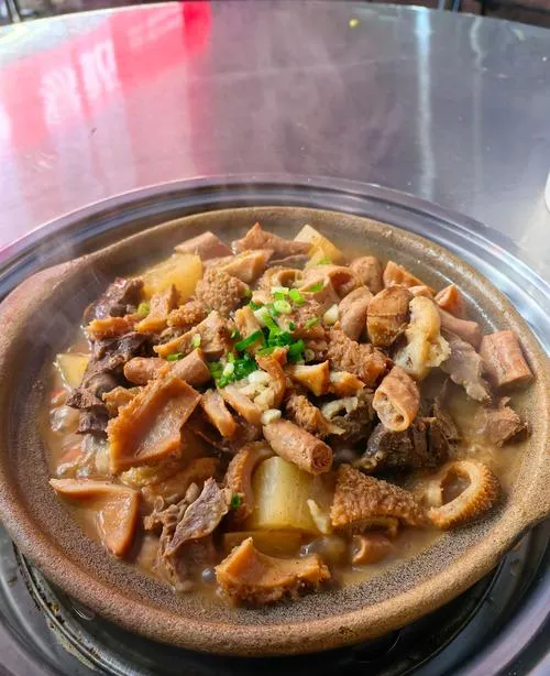 牛杂这东西,做好了是美味,做不好就是腥臊难闻,小刘这家店就在菜市场边上,专门做牛杂煲和牛杂粉,每天早上现杀牛、现做牛杂,保证新鲜。他家牛杂的处理功夫到家,牛肚洗得干净、没有异味,牛筋炖得软糯、一咬就断,牛肠处理得透彻、吃起来只有香没有腥,汤底是牛骨熬的,加了当归、陈皮、白胡椒,喝起来鲜香浓郁、又带着一点点药材的回甘,冬天来一碗牛杂煲,热气腾腾、浑身都暖和。