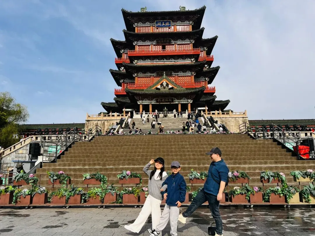 登上阁楼,看到九重天景观,站在高处看赣江,确实能感受到“落霞与孤鹜齐飞”的意境。早上去得早,人少,还拍了全家合照。十点多就逛完了,很顺利。