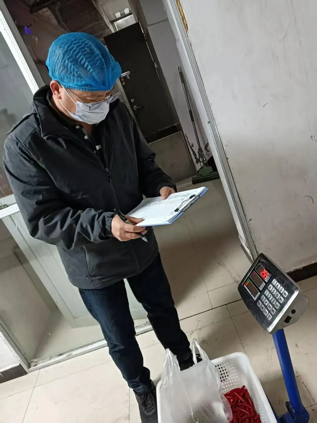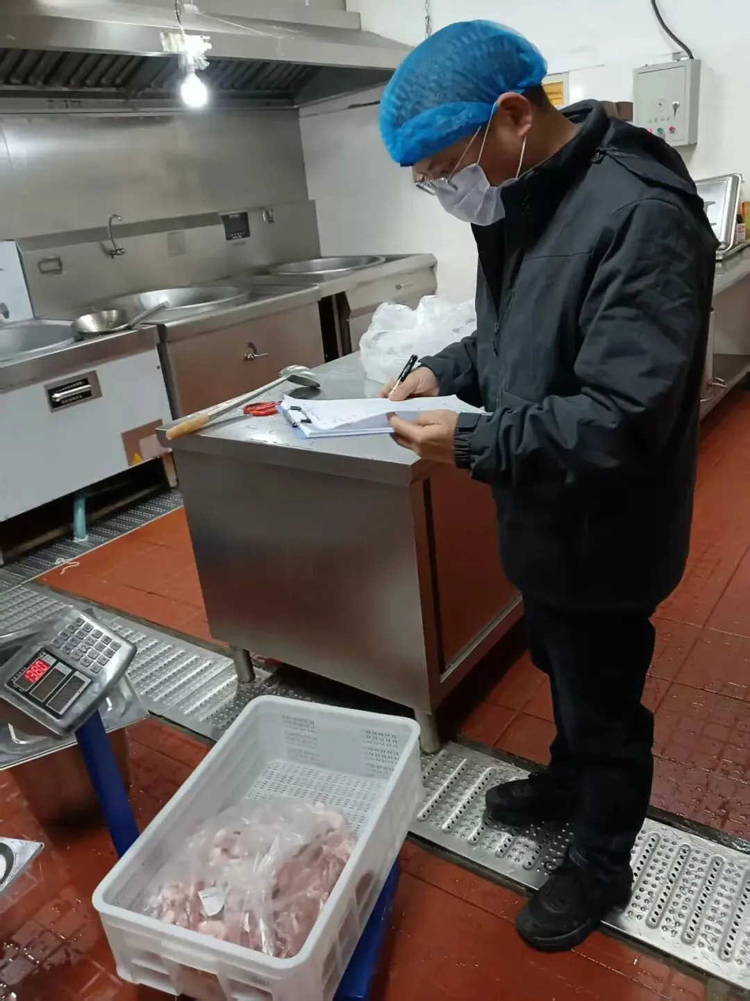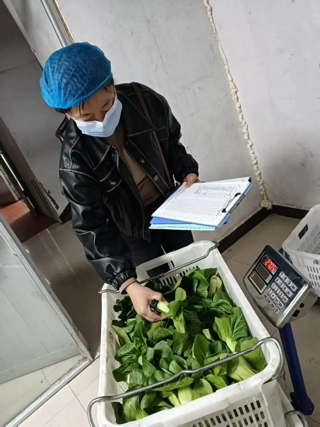 为保障师生饮食安全,十八中中层以上干部每天清晨前往食堂后厨,对食堂每日食材(菜类、重量等)进行验收,检查食材新鲜度和卫生情况。