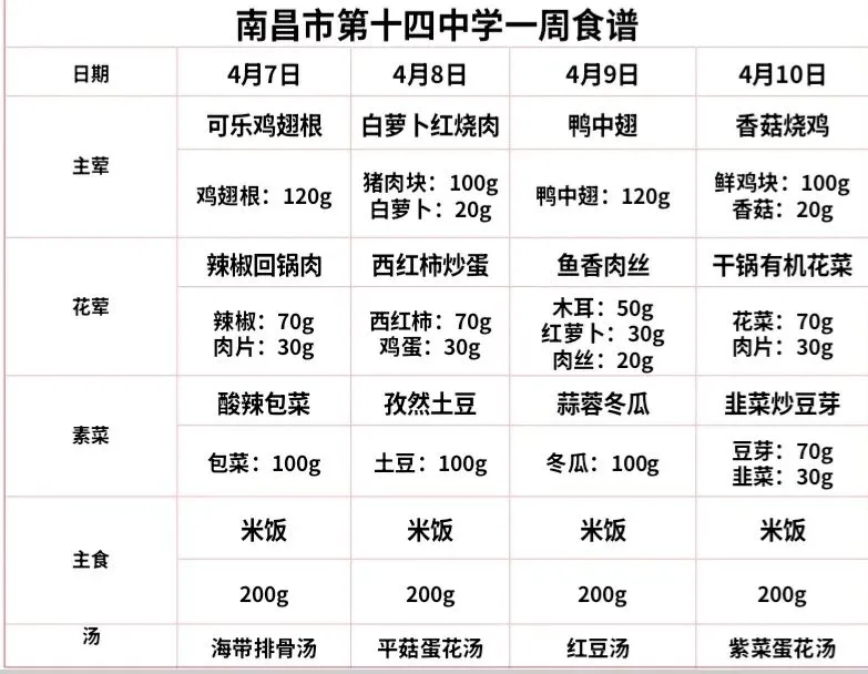 >南昌十四中一周菜谱早知道(2026年4月7日-2026年4月10日)