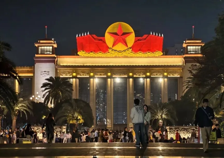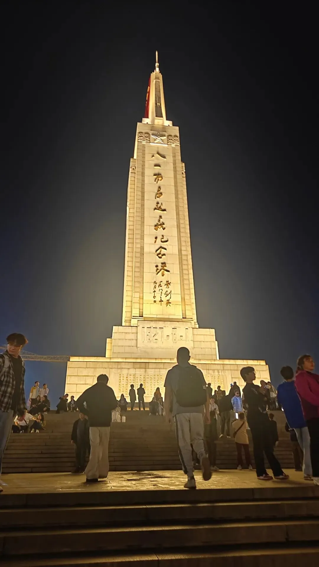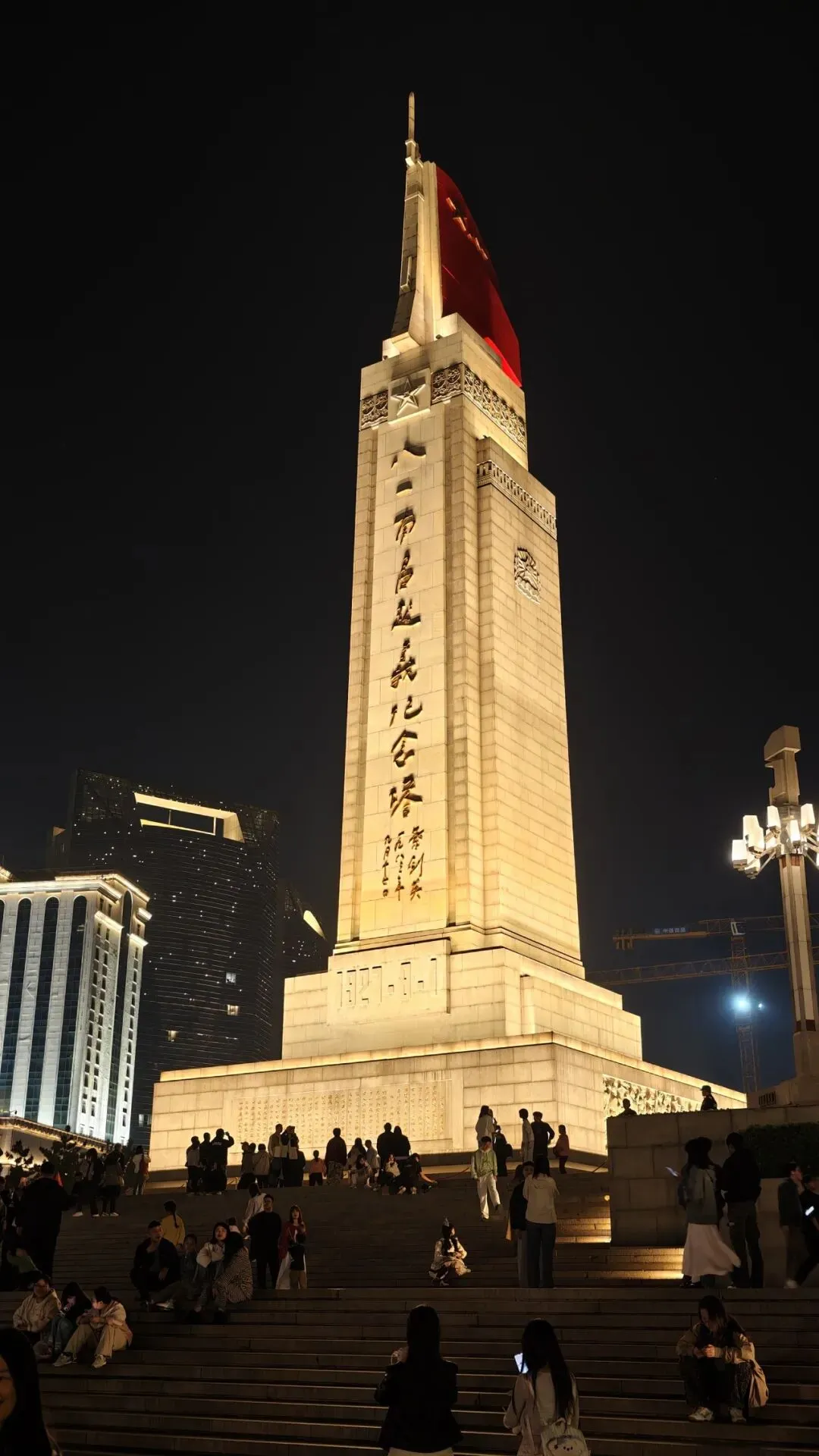 饭后打车到八一广场,英雄纪念碑静静矗立,叶帅题写的碑名在夜色里格外庄重。九十九年前,石破天惊的第一枪在这里响起;如今,月光漫过纪念碑,也漫过武商楼顶的灯火,历史的厚重与当下的悠闲,在同一轮明月下温柔相拥。