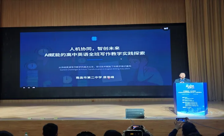 南昌市第一中学的唐思峰老师,分享了《AI赋能的高中英语全班写作教学实践探索》。用科技打破教学边界,让AI成为英语写作教学的得力助手,为传统课堂注入了全新的活力与可能。