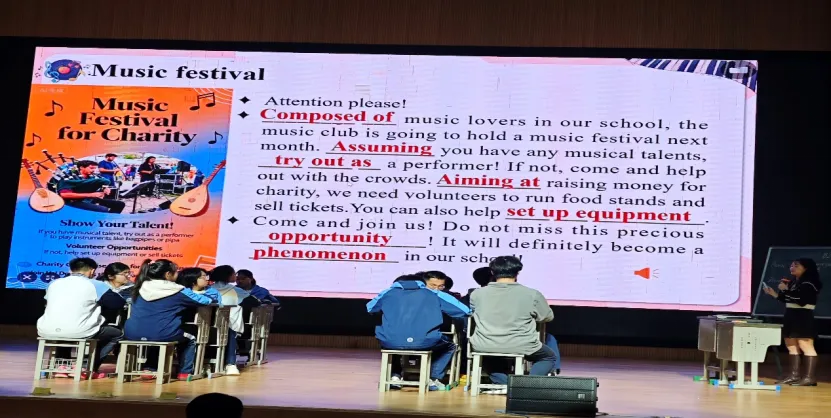 南昌市外国语学校的邓锦老师,呈现了《承乐韵·固新知·思新境:高中英语单元融合复习课例》。该课是高中英语必修一Unit 5 Music单元复习课,以音乐为核心,用猜游戏激活课堂,围绕词汇语法巩固、音乐话题表达、传统音乐与AI融合三大目标展开,结合相关文体梳理音乐价值,设计多样任务,落实知识、AI演绎视频探讨传统音乐传承创新;课后布置主题写作和AI创作英文歌选作业,融合知识巩固、能力提升与科技文化融合,实现单元复习多维目标。
