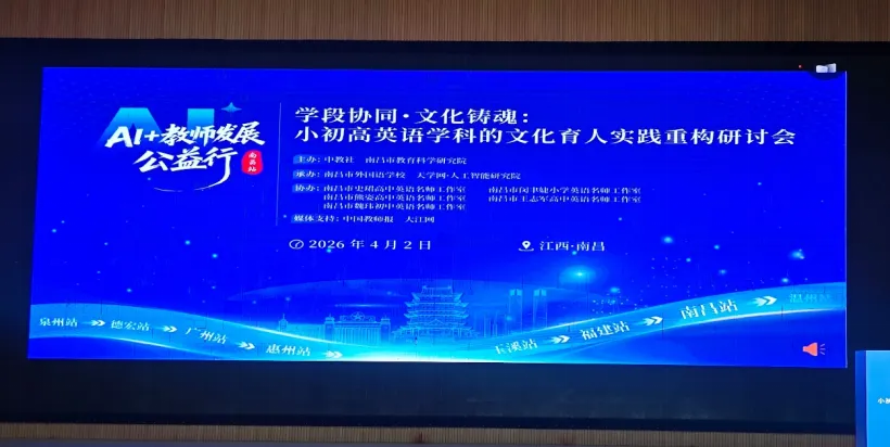 为深入推进教育数字化转型,落实英语学科文化育人理念,搭建小初高学段协同教研平台,AI+教师发展公益行暨学段协同·文化铸魂:小初高英语学科的文化育人实践重构研讨会于2026年4月2日在南昌市外国语学校九龙湖校区盛大启幕!