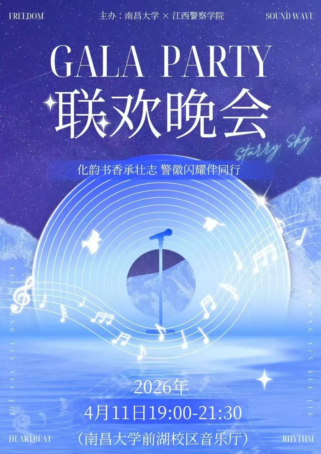 亲爱的同学们,一场跨越校园的青春邀约,正带着滚烫的期待向我们奔赴而来!南昌大学化学化工学院与江西警察学院治安管理系携手打造的联谊晚会,即将惊艳亮相!