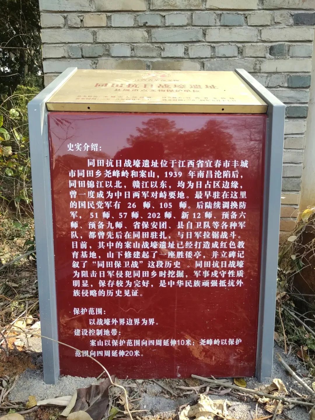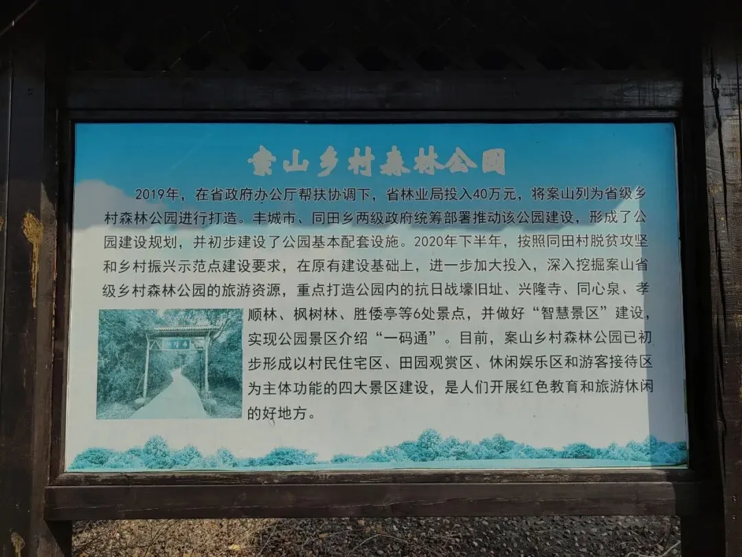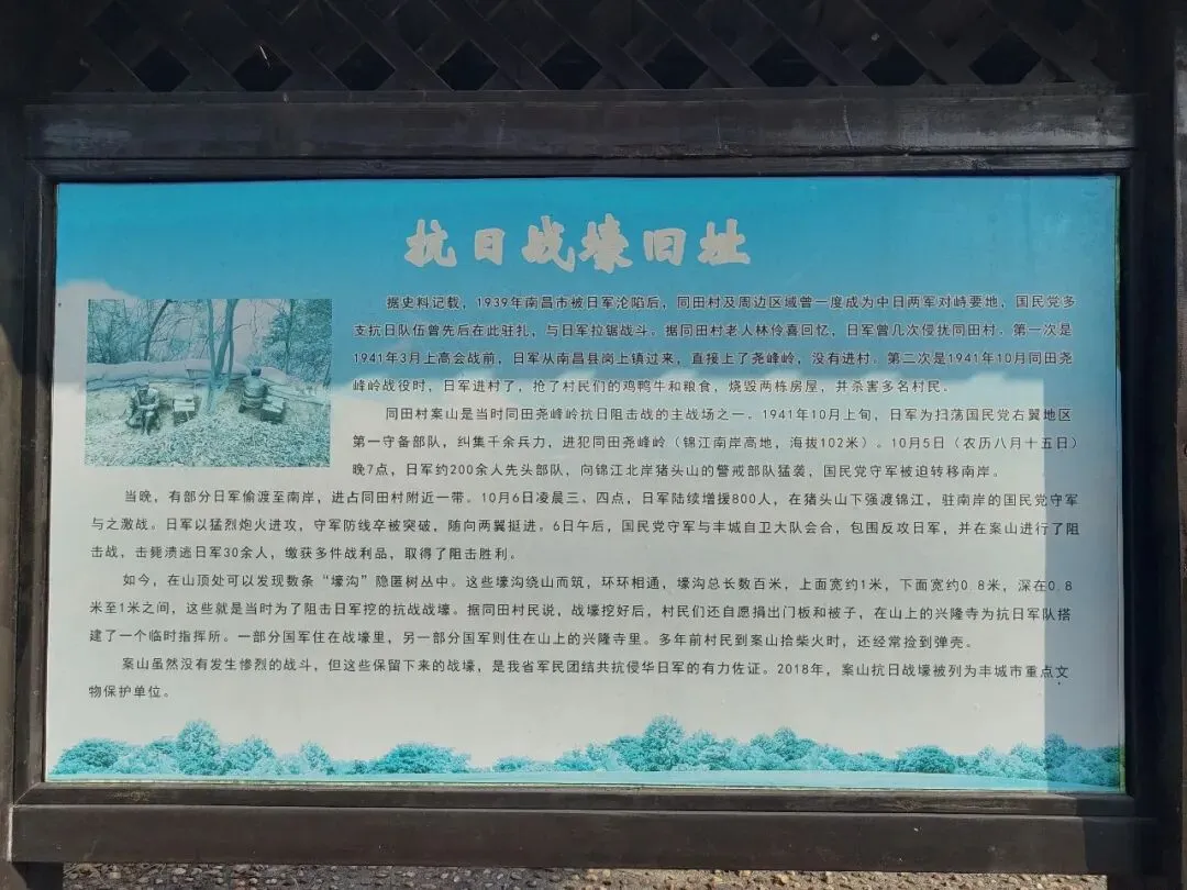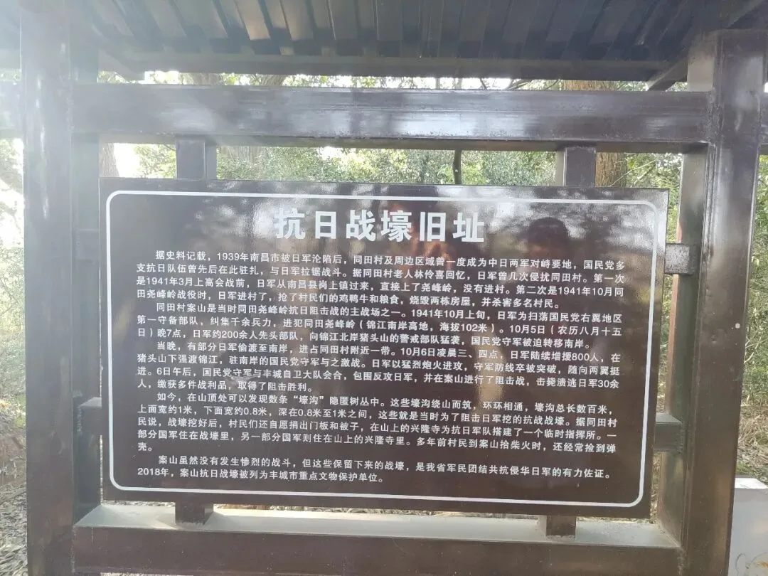 案山虽然没有发生惨烈的战斗,但这些保留下来的勺战壕,是我省军民团结共抗侵华日军的有力佐证。2018年,案山抗日战壕被列为丰城市重点文物保护单位。