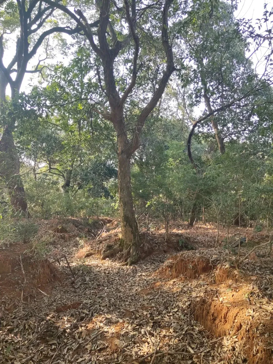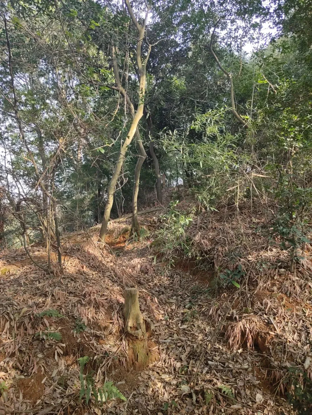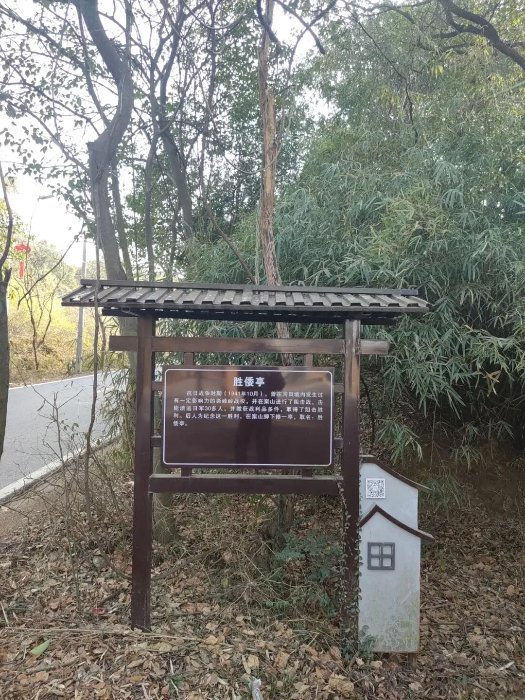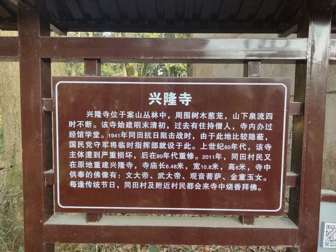 如今,在山顶处可以发现数条"壕沟"隐匿树丛中中。这些壕沟绕山而筑,环环相通,壕沟总长数百米,上面宽约1米,下面宽约0.8米,深在0.8米至1米之间,这些就是当时为了阻击日军挖的抗战战壕。据同田村民说,战壕挖好后,村民们还自愿捐出门板和被子,在山上的兴隆寺为抗日军队搭建了一个临时指挥所。一部分国军住在战壕里,另一部分国军则住在山上的兴隆寺里。多年前村民到案山拾柴火时,还经常捡到弹壳。