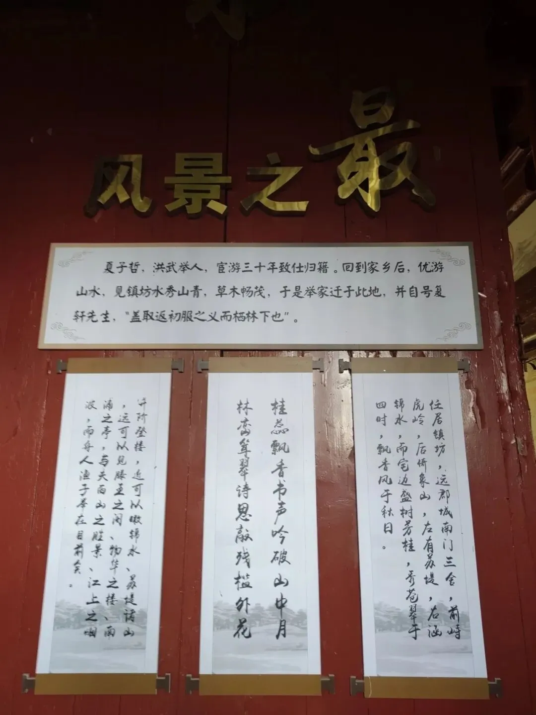 夏子哲,号复轩,洪武年间举人出身,曾出任枞阳、溧水等地巡检司的巡检。为使子孙读书上进,他便创建这座桂林书楼。书院建于风景优美的莲池之上,前眺虎岭,后倚象山,桂花飘香十里,书声日夜相闻。从明代到清代,书院的规模不断扩大,成为当地方圆几十里著名的学府。