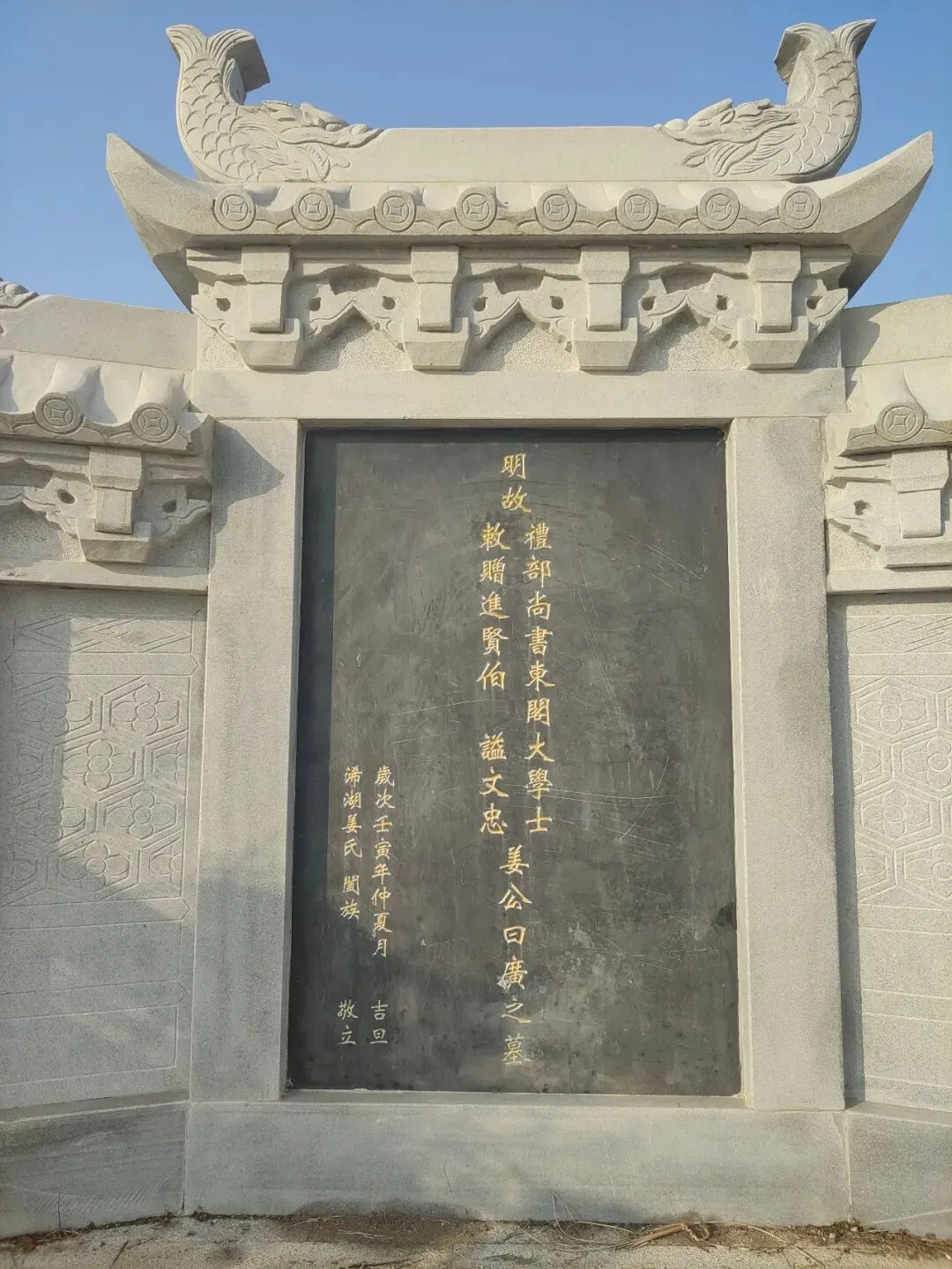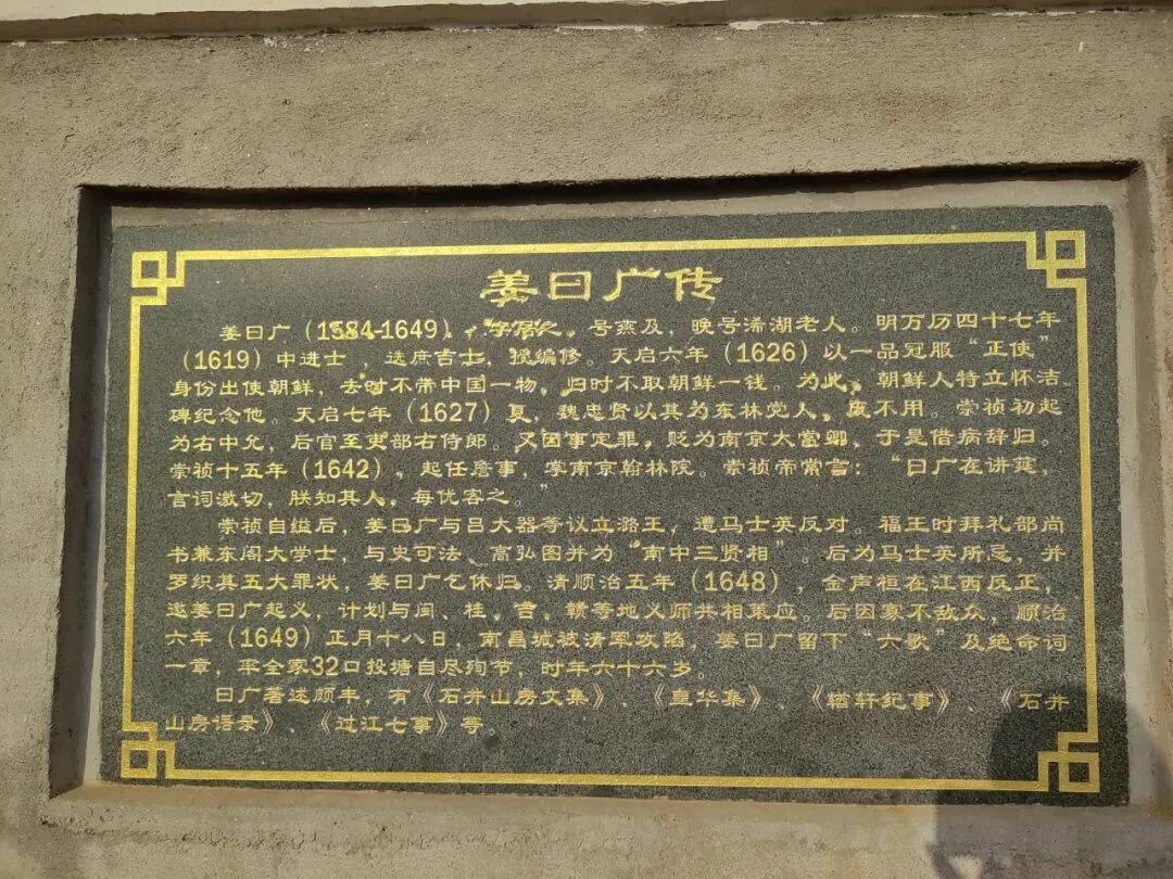 姜曰广,明万历四十七年(1619)中进士,选庶吉士,授编修。天启六年(1626)以一品冠服“正使”身份出使朝鲜,去时不带中国一物,归时不取朝鲜一钱。为此,朝鲜人特立怀洁碑纪念他。奉旨阅视岛帅毛文龙,上疏赞其为豪杰。天启七年(1627)夏,魏忠贤以其为东林党人,废不用。崇祯初起为右中允,后官至吏部右侍郎。又因事定罪,贬为南京太常卿,于是借病辞归。崇祯十五年(1642),起任詹事,掌南京翰林院。崇祯帝常言:“曰广在讲筵,言词激切,朕知其人,每优客之。”崇祯自缢后,姜曰广与吕大器等议立潞王,遭马士英反对。弘光时拜礼部尚书兼东阁大学士,与史可法、高弘图并为南中三贤相。后为马士英所忌,并罗织其五大罪状, 姜曰广乞休归。永历二年(1648),金声桓在江西反正,邀姜曰广起义,计划与闽、桂、吉、赣等地义师共相策应。后因寡不敌众,永历三年(1649)正月十八日,南昌城被清军攻陷,姜曰广留下“六歌”及绝命词一章,率全家32口投塘自尽殉节,一说缢于敕赐故翰林郭思颜仁臣之心坊下,时年六十六岁。