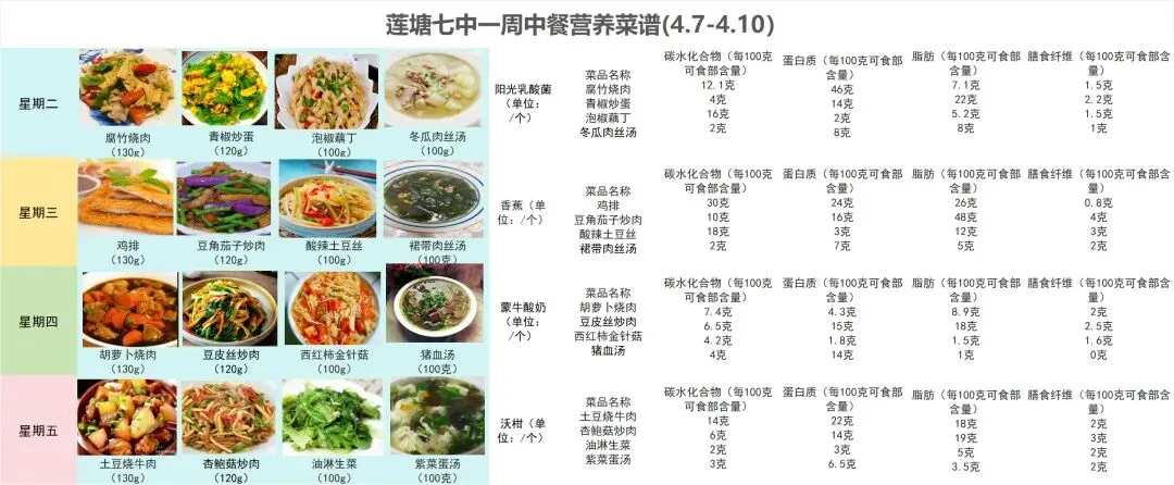 您好!孩子在校的每一餐,都牵动着我们的心。我们坚持食材严选、营养搭配,全力守护孩子们的健康成长。为了让您清晰了解孩子的在校饮食情况,现将下周(4.7-4.10)营养食谱公布如下。
