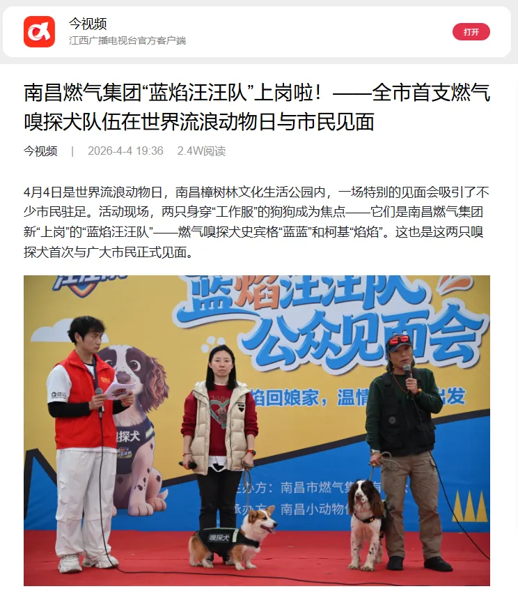 媒体报道 || 南昌燃气集团“蓝焰汪汪队”上岗啦!——全市首支燃气嗅探犬队伍在世界流浪动物日与市民见面(一)