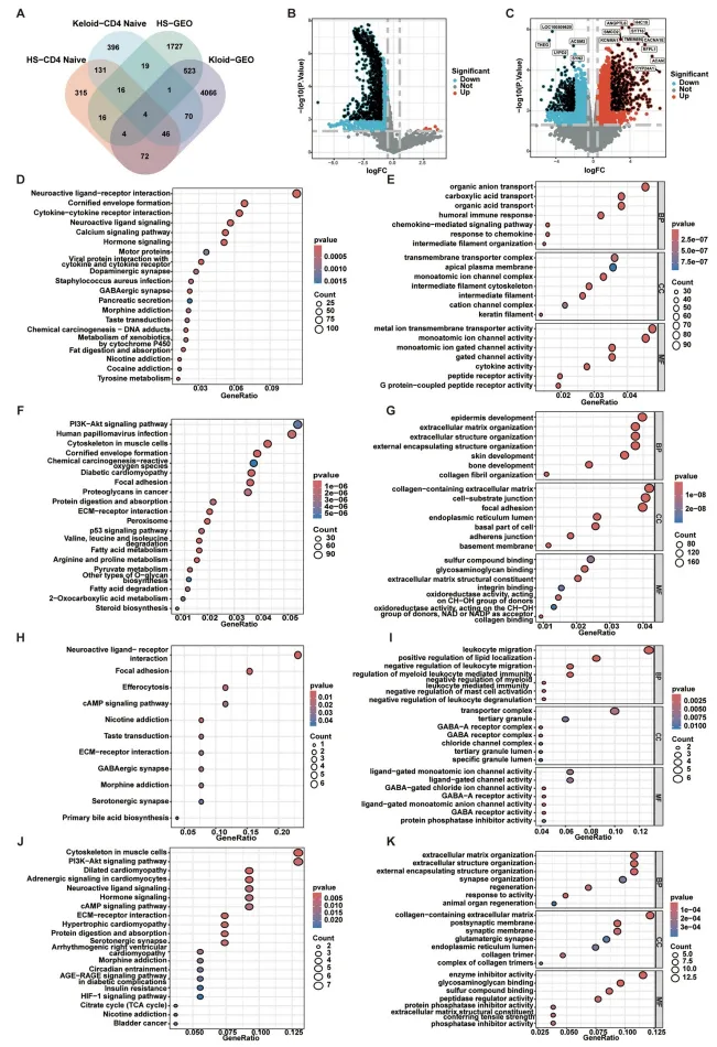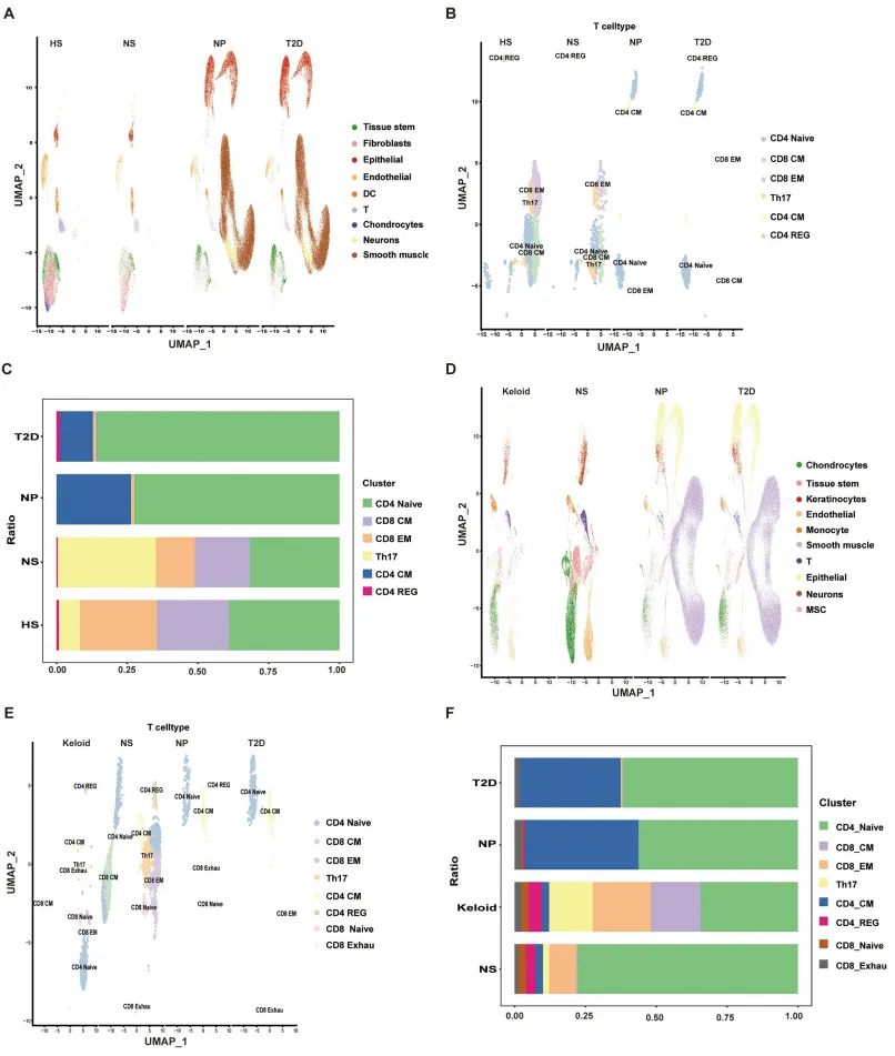 单细胞聚类注释发现,HS 中 CD4+NT 比例显著上调,K 中则显著下调,是两种瘢痕免疫微环境的关键差异;T 细胞亚群分析进一步证实该细胞在瘢痕中的表达特征与正常组织存在明显区别。