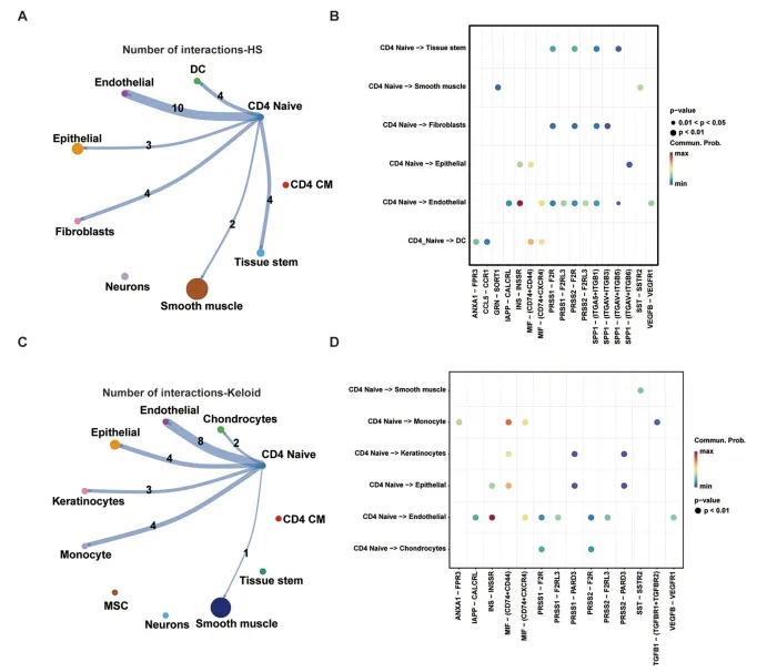 聚焦 CD4 + 初始 T 细胞,分析其在瘢痕中的比例变化及细胞间核心通讯通路。