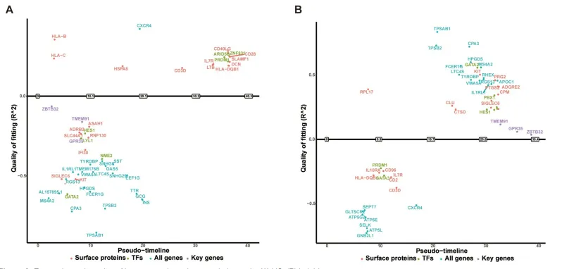 伪时间轨迹分析显示,核心基因在 HS 的 CD4+NT 中早期激活后快速沉默,在 K 中则中晚期逐渐上调;基因表达趋势验证了该差异,HS 中持续下调,K 中 GPR35、ZBTB32 显著上调。
