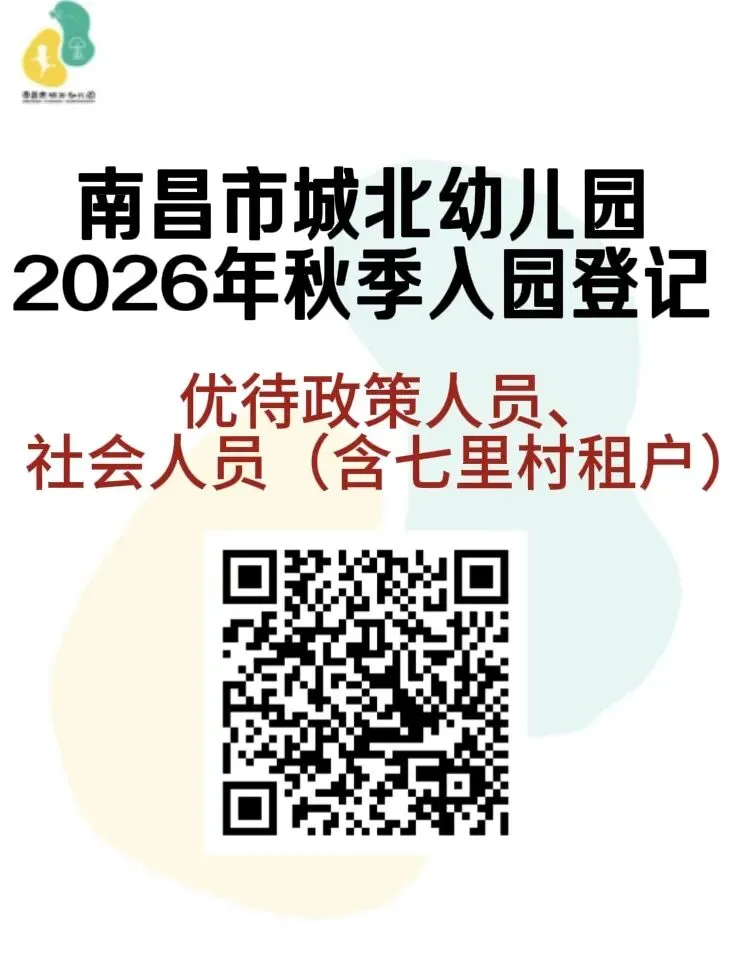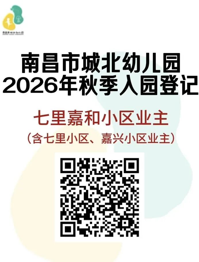 2.扫码登记:符合入园条件的幼儿,于2026年 4 月 11 日 上午 9 :00 至 4 月 15 日 21:00进入南昌市城北幼儿园微信公众号——点击置顶链接“2026年秋季招生公告”——扫描“南昌市城北幼儿园2026年秋季入园登记二维码【七里嘉和小区业主】”;或扫描“南昌市城北幼儿园2026年秋季入园登记二维码【优待政策人员、社会人员(含七里村租户)】”——信息登记。