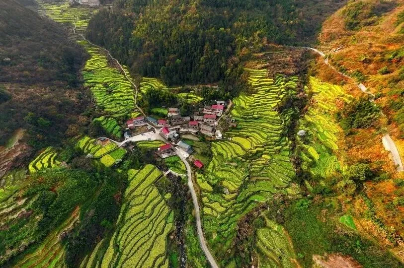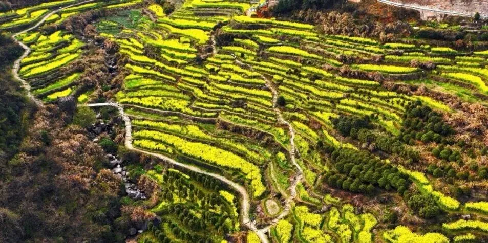 如果时间充裕,下午可以去牛岭村,这里的油菜花是沿着山势开垦的梯田,层层叠叠,比平地花海更有层次感。航拍视角下,蜿蜒的山路和金黄的花田构成美丽的曲线。这里完全免费,可以直接开车到村里,非常方便。