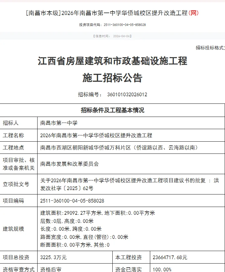 近日,江西省公共资源交易平台发布了《2026 年南昌市第一中学华侨城校区提升改造工程》的施工招标公告。