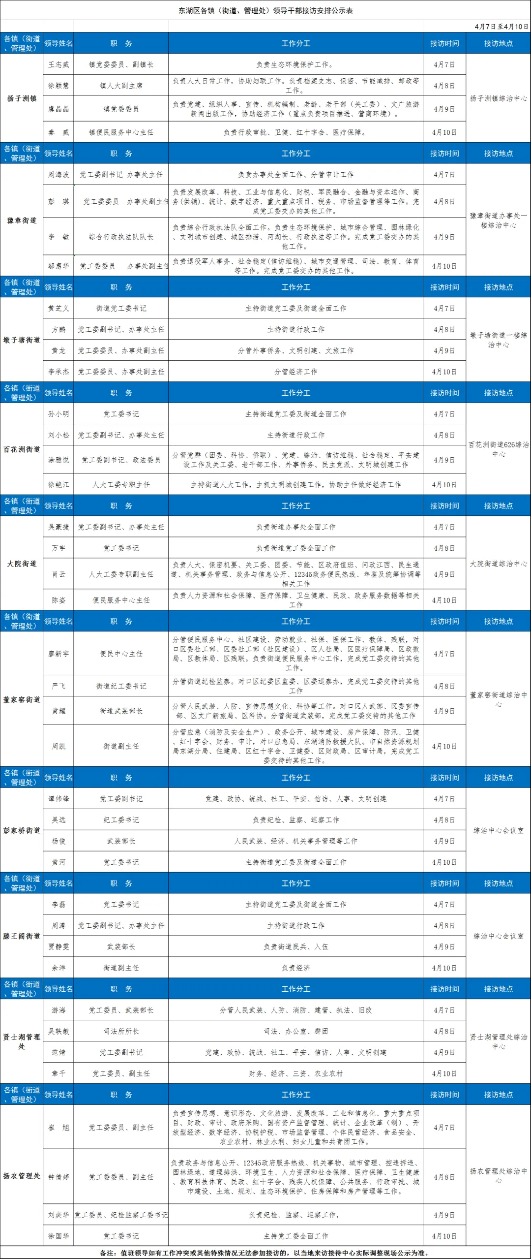 为深入贯彻落实习近平总书记关于加强和改进人民信访工作重要思想,进一步畅通和规范群众诉求表达、利益协调、权益保障通道,依法按政策及时就地解决群众合理诉求,现将近期南昌市东湖区各镇(街道、管理处)领导干部接访安排予以公告。
