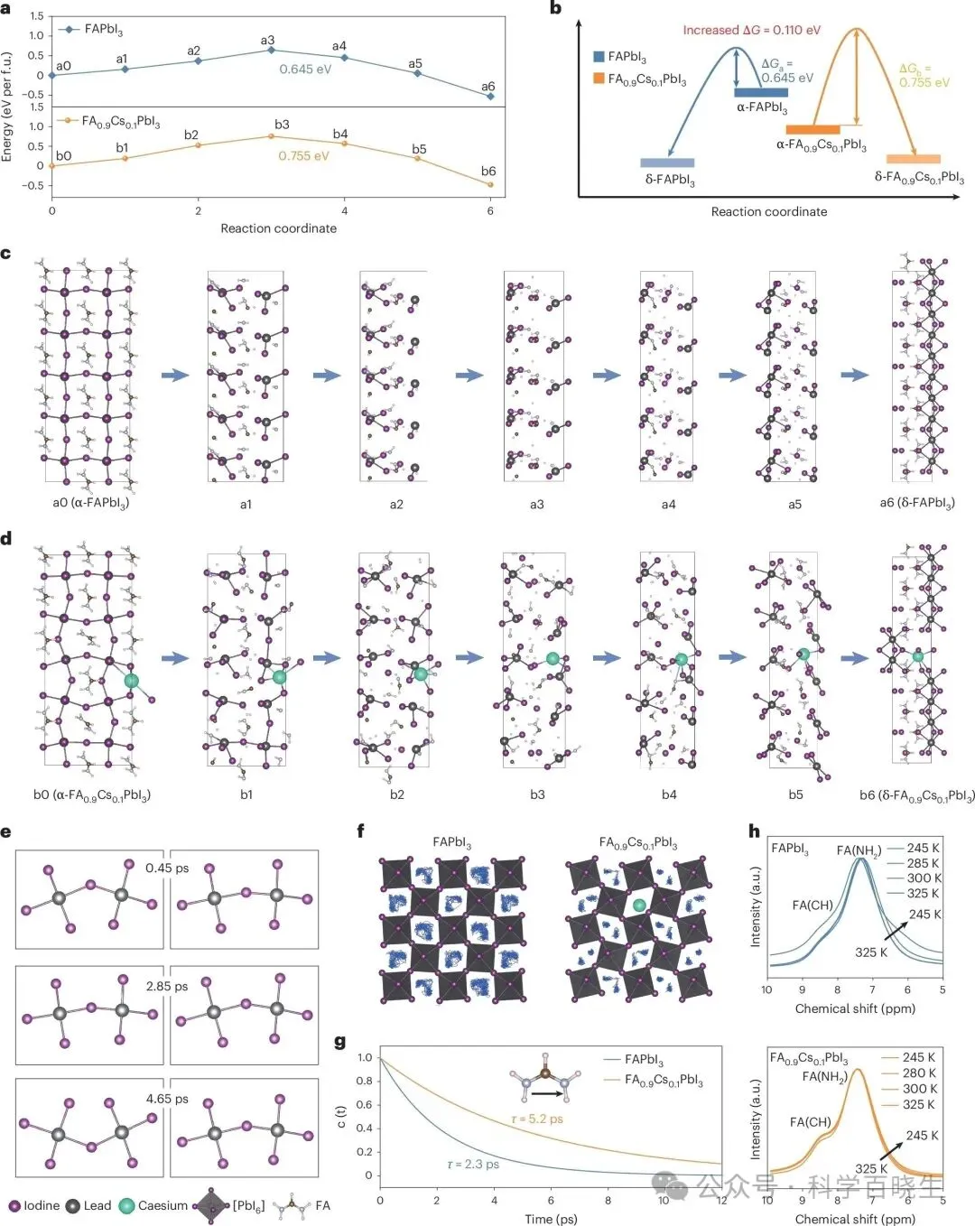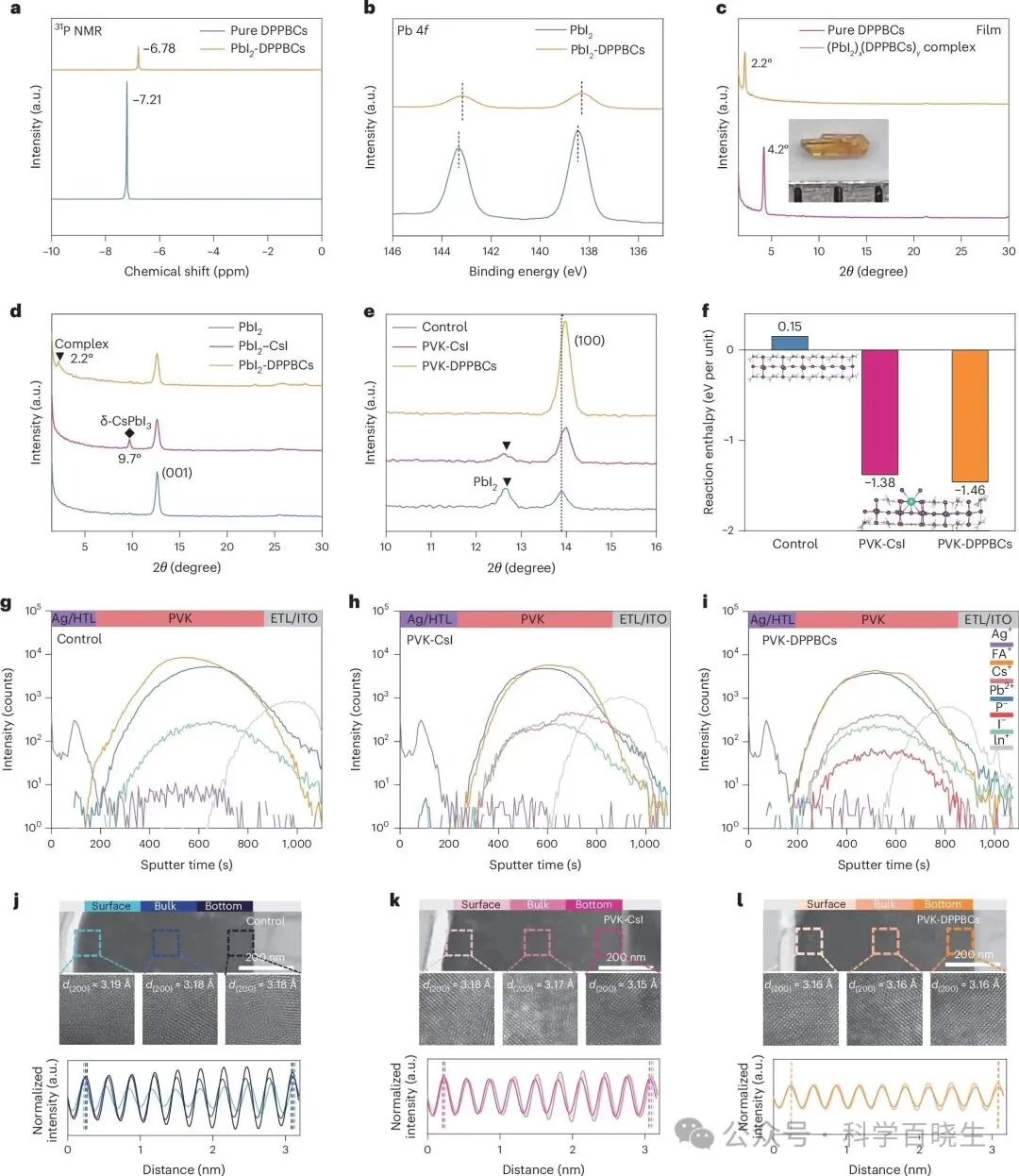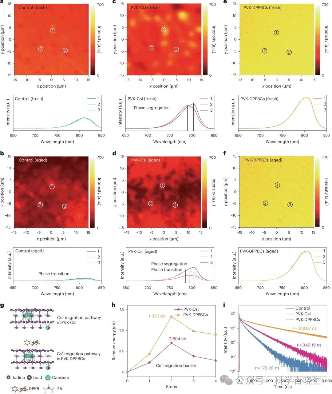 有机-无机钙钛矿太阳能电池(PVSCs)因其卓越的光伏性能和简单的溶液加工优势而被誉为可持续能源之星,其功率转换效率(PCE)已超过26.7%。然而,器件稳定性问题仍是商业化应用面临的关键挑战。一步法因其制备工艺简单而备受关注,但复杂的晶体生长动力学需要更多努力来优化工艺,且对操作人员技能依赖较高。真空闪蒸过程中难以精确控制的蒸发速率和缓慢的溶剂去除速度,导致钙钛矿相变过程复杂且薄膜均匀性较差。此外,蒸发法制备的PVSCs效率目前仍无法与溶液法制备的器件相媲美。两步法独特的成核与晶体生长分离特性,能更好地调控结晶过程,有利于在大规模制备中获得均匀性更高、重复性更好的钙钛矿薄膜,为未来商业化应用提供了巨大潜力。值得注意的是,目前报道的基于两步法制备的高性能PVSCs主要为甲脒(FA)基器件。然而,α-FAPbI₃钙钛矿在室温下会不可避免地转化为无光伏活性的δ-FAPbI₃,严重损害了器件的稳定性。本研究设计出4-(二苯基膦)苯甲酸铯盐,实现了高效铯离子掺杂并均匀化阳离子分布,获得了相稳定性提升的高质量钙钛矿薄膜。基于此,通过两步法制备的太阳能电池实现了26.91%的效率(认证效率26.61%)。采用热稳定电荷传输层的器件在1个太阳光照射、最大功率点跟踪及85℃条件下持续运行1500小时后(ISOS-L-2标准),仍保持初始效率(23.76%)的95%。本研究揭示了FA₀.₉Cs₀.₁PbI₃的相变路径及相应过渡态结构,并阐明了钙钛矿中铯离子驱动晶格稳定的作用机制。1.为探究铯离子(Cs⁺)对提升FAPbI₃晶格稳定性的作用机制,本研究通过密度泛函理论(DFT)阐明了FAPbI₃与FA₀.₉Cs₀.₁PbI₃体系从α相到δ相的相变过程。图1a-d展示了潜在的相变路径及相应的过渡态晶体结构。对于FAPbI₃钙钛矿,相变始于[PbI₆]⁴⁻八面体的旋转并引发晶格参数改变,其中[PbI₆]⁴⁻八面体旋转导致Pb–I–Pb键断裂与碘离子迁移(能垒为0.645 eV)(图1a,b)。Pb–I键断裂促使立方相α-FAPbI₃中三维共顶点的[PbI₆]⁴⁻八面体转变为六方相δ-FAPbI₃中面共享的一维链状[PbI₆]⁴⁻八面体(图1c,结构a0–a3)。随后,六方短链从1×1排列扩展为1×5构型,并通过沿(011)方向八面体剪切演化为δ相(图1c,结构a4–a6),这与先前研究结果一致。2.值得注意的是,FA₀.₉Cs₀.₁PbI₃钙钛矿在相变过程中观察到的Pb–I键断裂更少(图1d,结构b0–b3),这可能与Cs⁺掺杂后[PbI₆]⁴⁻八面体晶格收缩及Pb–I–Pb倾斜角减小有关,导致热力学相变能垒升高至0.755 eV。此外,本研究进一步探讨了Cs⁺对[PbI₆]⁴⁻八面体振动的影响。如图1e所示,相较于FAPbI₃中Pb–I–Pb角在约120°至180°范围内的强烈振荡,FA₀.₉Cs₀.₁PbI₃中[PbI₆]⁴⁻八面体的摆动幅度显著降低。Cs⁺对八面体振动的"锁定"作用增强了晶格稳定性,减少了Pb–I键断裂。随着Cs⁺含量增加,N–H伸缩振动频率逐渐红移,表明FA⁺与[PbI₆]⁴⁻八面体间的N–H···I氢键强度增强,从而提升了钙钛矿稳定性。图2|两步法中DPPBCs实现Cs⁺有效掺杂的机理1.先前研究已证实含磷路易斯碱分子能有效结合未配位的铅原子。因此,本研究首次设计并合成了DPPBCs,通过其磷原子与PbI₂的强相互作用抑制δ-CsPbI₃形成,从而获得高质量FAₓCs₁₋ₓPbI₃钙钛矿薄膜。如图2a所示,³¹P核磁共振谱显示DPPBCs掺入PbI₂形成PbI₂-DPPBCs复合物后,磷化学位移移至-6.78 ppm,证实了DPPBCs与PbI₂的强相互作用。X射线光电子能谱(XPS)检测到PbI₂-DPPBCs样品中Pb 4f峰向低结合能方向移动,进一步验证了这一结论(图2b)。此外,通过X射线衍射(XRD)图谱分析了PbI₂与DPPBCs复合物((PbI₂)ₓ(DPPBCs)ᵧ)薄膜,其潜在晶体结构如图2c所示。2.本文通过XRD进一步研究了掺入CsI(PbI₂-CsI)和DPPBCs对PbI₂薄膜结晶的影响。如图2d所示,由于δ-CsPbI₃相形成能较低²¹,在PbI₂-CsI薄膜中观察到其衍射峰(9.7°)。而PbI₂-DPPBCs薄膜中未发现δ-CsPbI₃相,但检测到与(PbI₂)ₓ(DPPBCs)ᵧ晶体相关的新衍射峰(2.2°),进一步证明DPPBCs与PbI₂的强相互作用。3.为深入研究PbI₂薄膜结晶过程,在退火过程中进行了半原位XRD测试。与纯PbI₂薄膜相比,PbI₂-CsI中(001)晶面峰强降低可归因于δ-CsPbI₃相对PbI₂生长的抑制。此外,PbI₂-DPPBCs薄膜中PbI₂与DPPBCs的配位作用可能延缓了PbI₂的生长(37.6秒)。通过XRD进一步评估了不同PbI₂结构对钙钛矿晶体结构演变的影响。图2e显示,与对照薄膜相比,引入CsI(PVK-CsI)和DPPBCs(PVK-DPPBCs)后钙钛矿(100)和(200)晶面的衍射角增大,表明Cs⁺有效进入了钙钛矿晶格。值得注意的是,PVK-DPPBCs样品中未出现PbI₂衍射峰,且钙钛矿(100)晶面峰强增强,证实了Cs的成功掺杂及对δ-CsPbI₃生成的有效抑制。PVK-DPPBCs薄膜吸收边和光致发光峰的蓝移进一步验证了上述结果。1.钙钛矿薄膜中离子的不均匀分布可能导致严重的相分离现象,进而影响器件寿命。通过二维光致发光强度分布图,研究了钙钛矿薄膜在环境气氛中持续光照老化48小时后的相分离演变过程(图3a-f)。光致发光发射光谱显示选定区域存在峰值波动。对照组薄膜因经历相变过程,老化后光致发光强度显著下降(图3a,b)。同时,PVK-CsI薄膜老化后不仅光致发光强度降低,区域2和3还出现峰分裂现象(图3c,d),揭示了薄膜内部存在相分离。对于PVK-DPPBCs薄膜,光照老化后未出现明显变化(图3e,f),进一步证明DPPBCs的引入有助于提升钙钛矿薄膜的稳定性。此外,目标钙钛矿薄膜在热循环老化后未检测