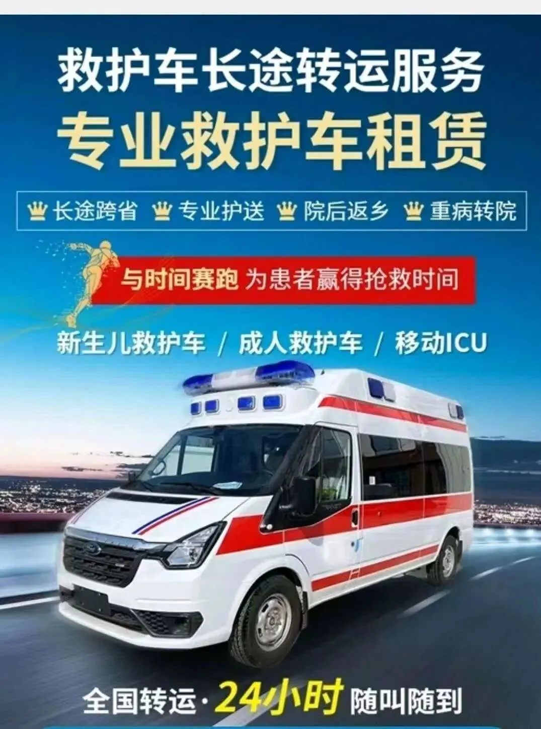 【专业服务】救护车出租服务:提供正规120救护车租赁,满足各类医疗需求,按需配备基础或重症监护设备,灵活选择服务时长。跨省长途转运:专业完成跨省市患者安全转运,配备ICU级救护车,全程医疗监护,支持多种交通接驳。危重病人转运:为重症患者提供专业医疗护送,特别配备呼吸机、心电监护等急救设备,医护全程陪护。术后康复转运:安全护送术后患者回家或康复机构,配备专业担架和护理设备,确保转运过程平稳舒适。新生儿转运:为早产儿和患病新生儿提供专业护送,配置新生儿保温箱和专用监护设备,专业儿科医护随行。