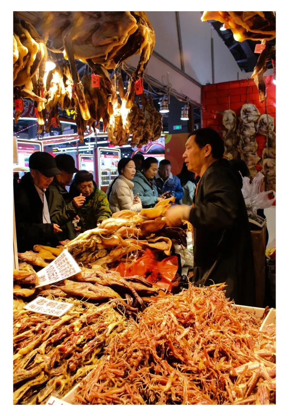 该作品以暖光勾勒腊味摊位,展现人群互动,生动呈现春节前传统市集腊香四溢的生活场景。