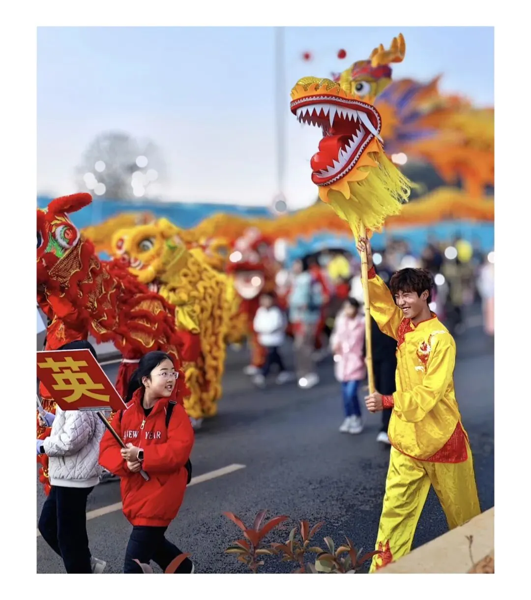 街头龙狮闹春,锣鼓喧天,少年举龙昂首;路人驻足,现场洋溢着喜庆祥和的气息。