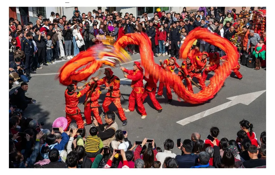 田头古镇元宵佳节,金龙腾跃,红衣挥杆,锣鼓喧天,人潮共赏千年民俗,传递客家年味与团圆之喜。