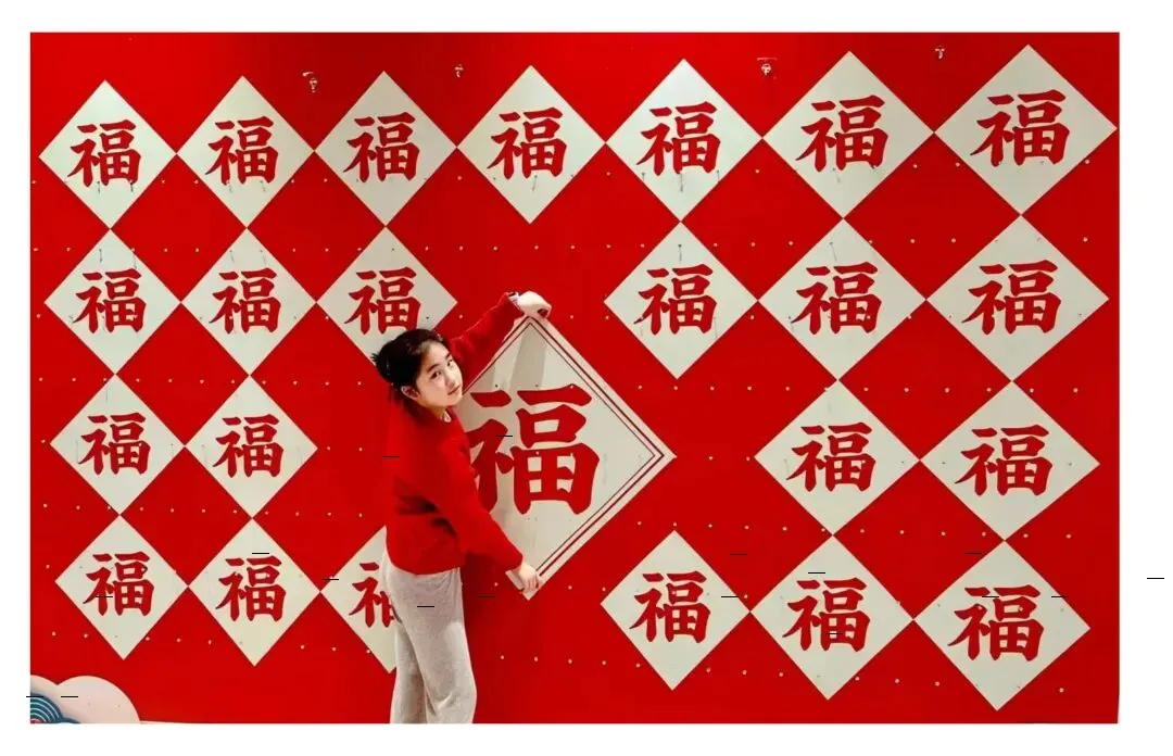 福墙映喜,福气盈门。少女贴罢福字,回望满桌团圆,年味在笑靥间流转。