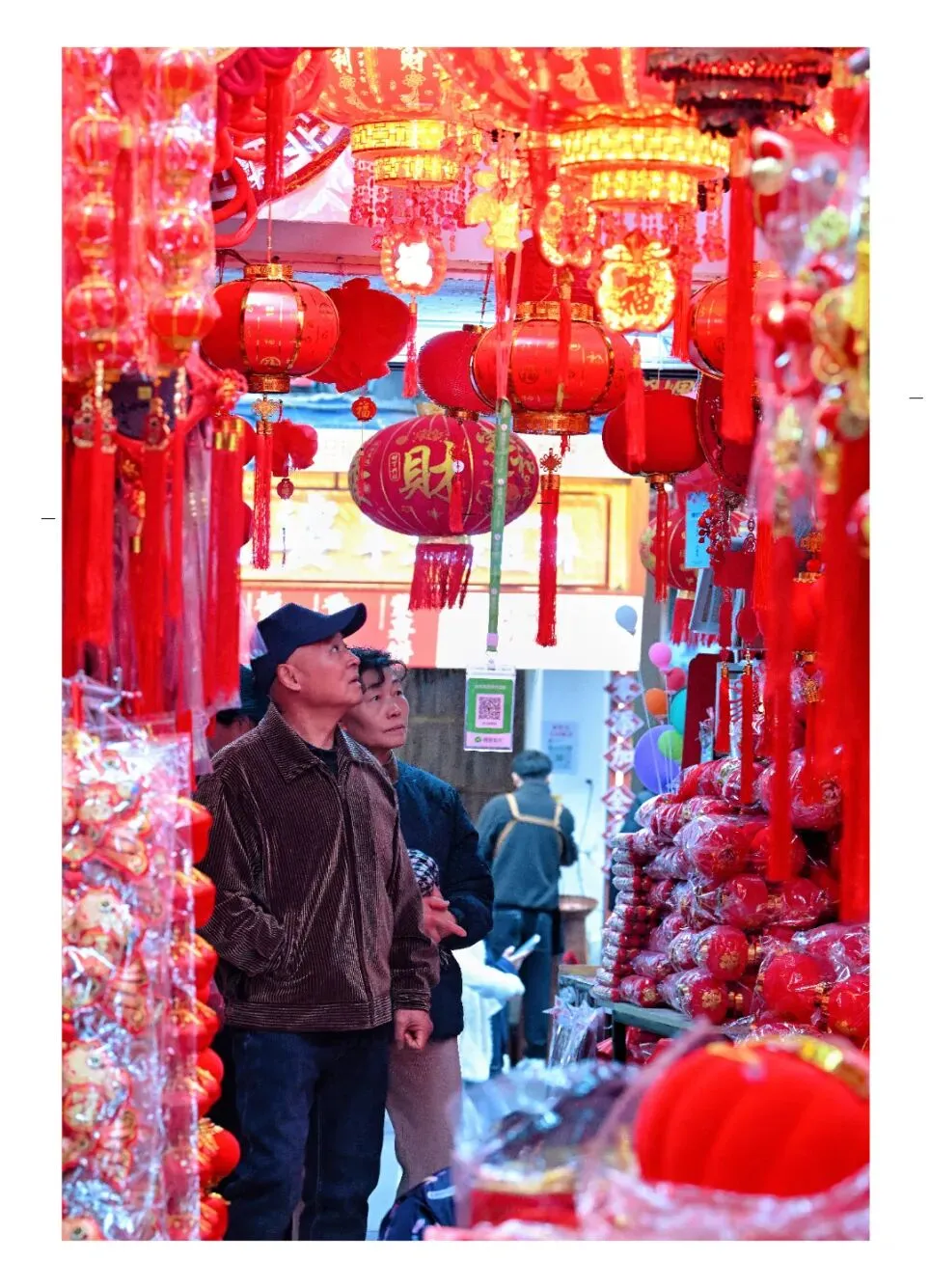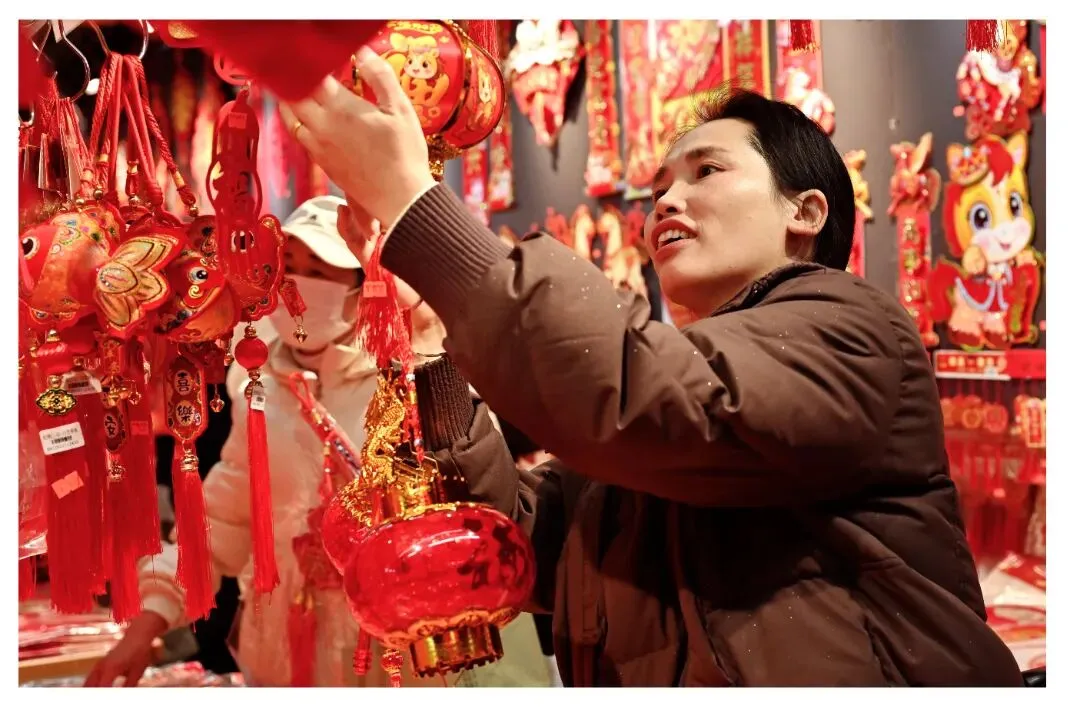 年货集市上,顾客精心挑选马年节庆饰品,年味洋溢,满含迎春喜悦。