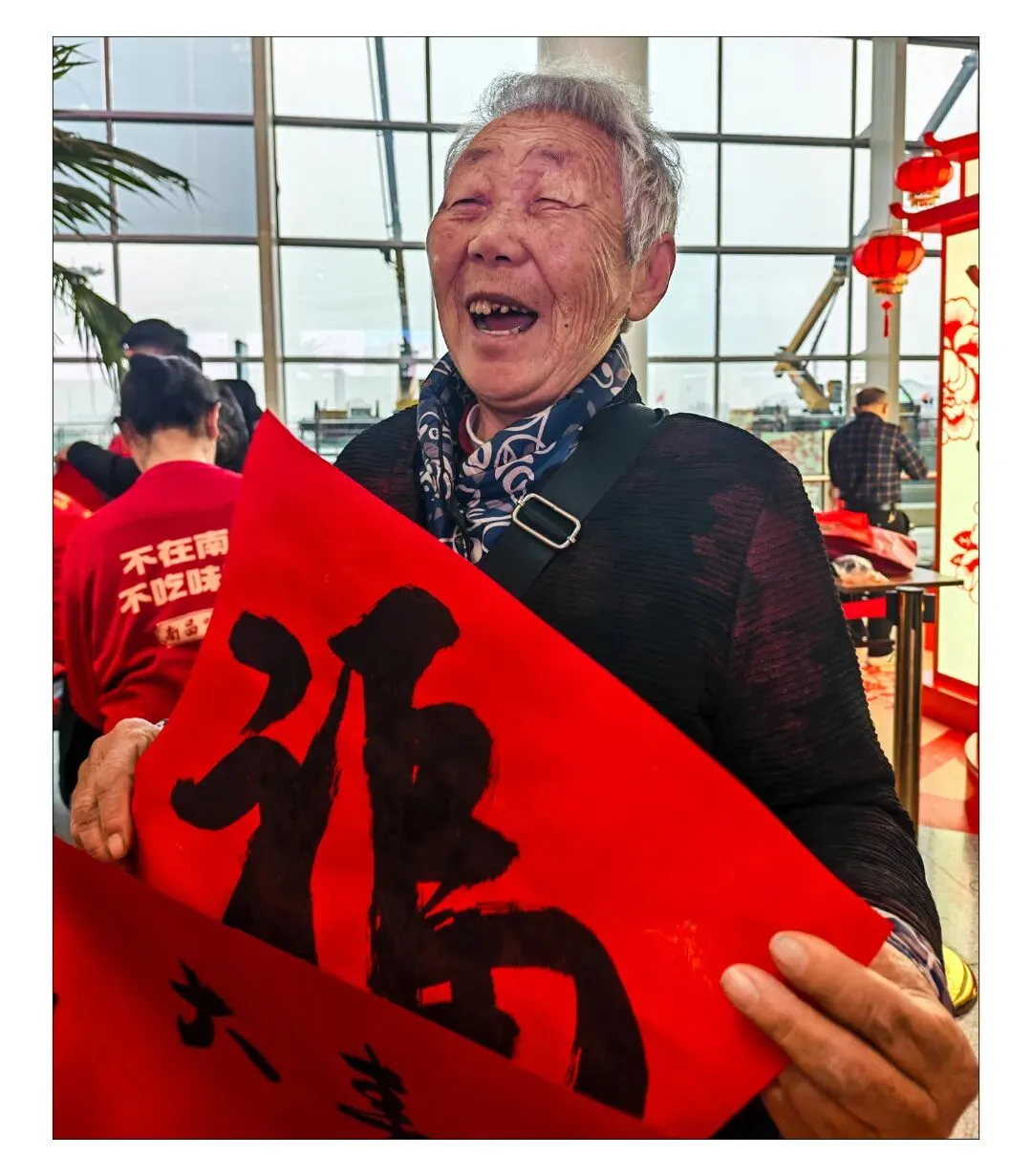 年前,南昌市老年大学赴昌北机场开展送“福”活动。一位北京游客接过红“福”,喜悦之情溢于言表。