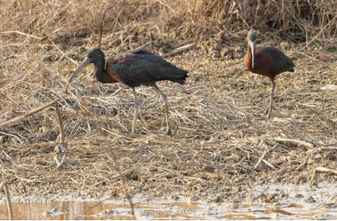 沿着栈道慢慢行走,远处的白鹤群像一团团白雪,在浅滩上优雅觅食。正当我为没见到长嘴鹬感到些许遗憾时,两只彩鹮正站在不远处的泥滩上,长长的弯曲喙部探入淤泥中,小心翼翼地捕食水生昆虫。它们的姿态优雅从容,羽毛在午后的阳光下变幻着紫、蓝、绿等多种色彩,美得让人挪不开眼。