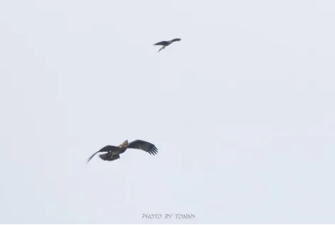 最惊心动魄的一幕,发生在一个转弯处。我正停车观察远处的山景,忽然看见一只体型硕大的猛禽从山头盘旋而起,翅膀展开时姿态雄健,一看就不是普通的鹰类。更精彩的是,一只小鹰(后来推测是松雀鹰)突然冲了上去,与它在空中展开了短暂的“对决”,两只猛禽时而追逐,时而对峙,最终那只大猛禽振翅一挥,朝着山谷深处飞去。