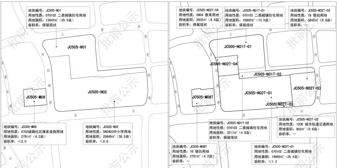 将JC505-N02地块拆改为多宗地块,其中JC505-N01T-02地块为住宅用地,4.8亩,保留现状;JC505-N02T-01地块为住宅用地,25.4亩,容积率1.2;JC505-N02T-02地块为城市轨道交通用地,0.9亩;JC505-N02T-03地块为留白用地,8.84亩;JC505-N02T-04地块为教育用地,4.4亩,保留现状;JC505-N01T-01地块为住宅用地,15亩,保留现状。