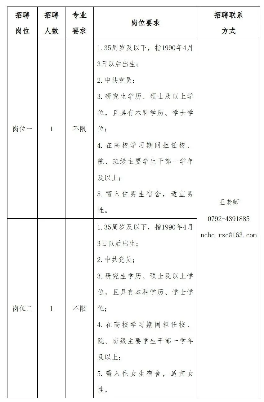 (二)岗位、人数、要求及联系方式一览表