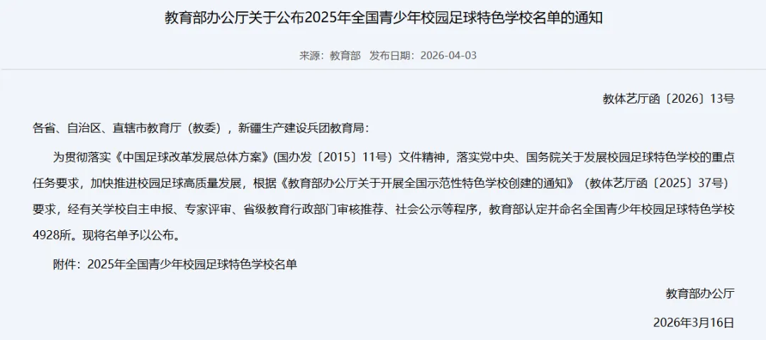 近日,教育部网站公布《2025年全国青少年校园足球特色学校名单》,经有关学校自主申报、专家评审、省级教育行政部门审核推荐、社会公示等程序,教育部认定并命名全国青少年校园足球特色学校4928所。江西省一共44所学校上榜,其中南昌5所。和小豹一起来看~