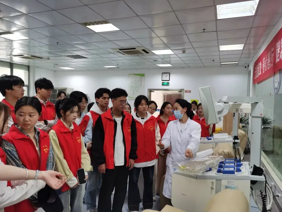 随后,师生们有序走进血液科普馆、采血大厅、成分制备科、检验科、供血科等核心工作区域,实地探访“一袋血的生命旅程”。在采血大厅,同学们观摩了医护人员规范的采血流程,看到献血者们从容奉献的身影,纷纷心生敬意;在成分制备科,大家了解到采集后的全血需经过离心、分离、提纯等多道工序,制成红细胞、血浆、血小板等不同成分,实现血液资源的精准高效利用;在检验科,先进的检测设备、严谨的检测流程,让同学们深知每一袋血液都要经过严格筛查,才能确保临床用血的绝对安全;在供血科恒温恒湿的储血库中,一排排整齐摆放的血液制品,如同守护生命的“生命宝库”,深深震撼着每一位师生。