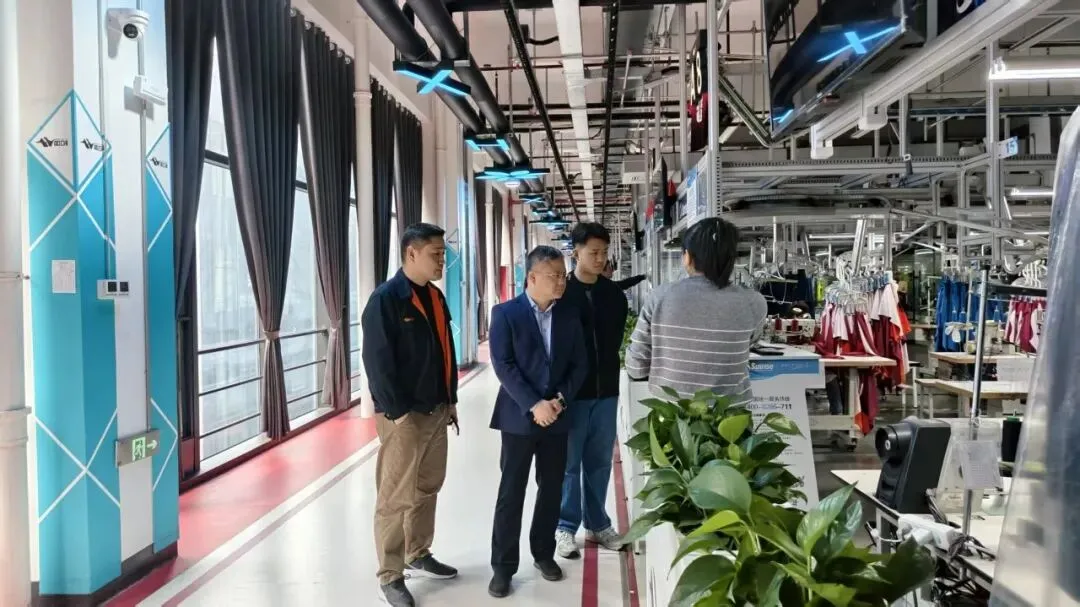 中国电信南昌分公司总经理章在斌一行首先在我会名誉会长单位南昌华兴针织实业有限公司实地参观5G智慧工厂。在负责人引导下,大家现场观看了全自动吊挂系统、智能运输分拣存储系统等智能化设备的运行情况,深入了解设备协同、数据协同等方面的应用成效。