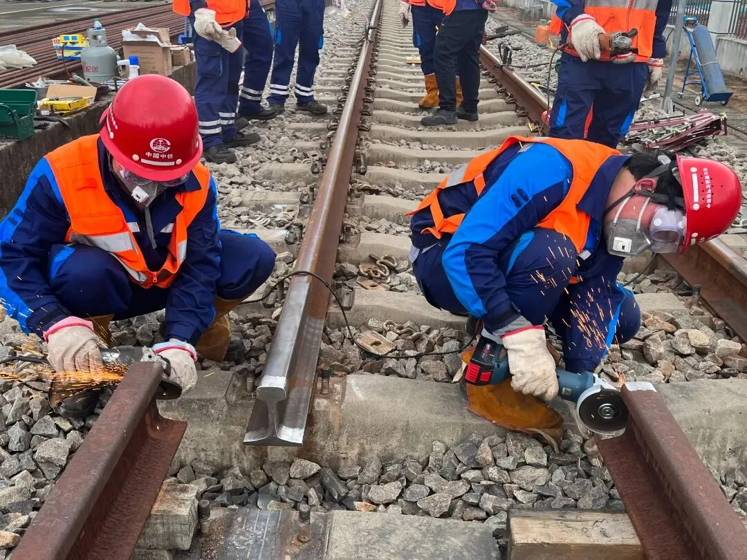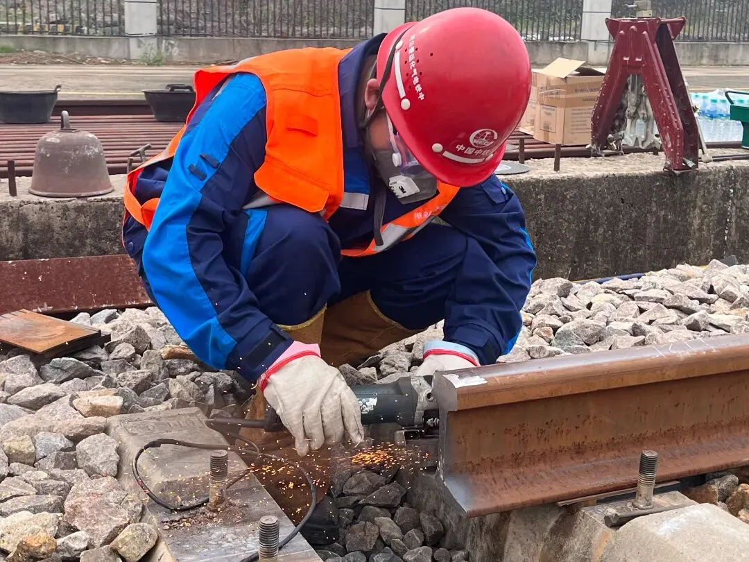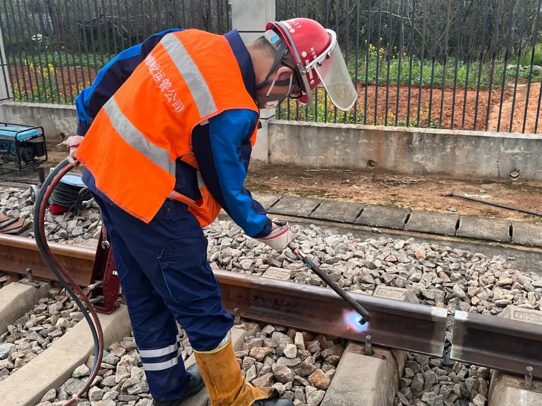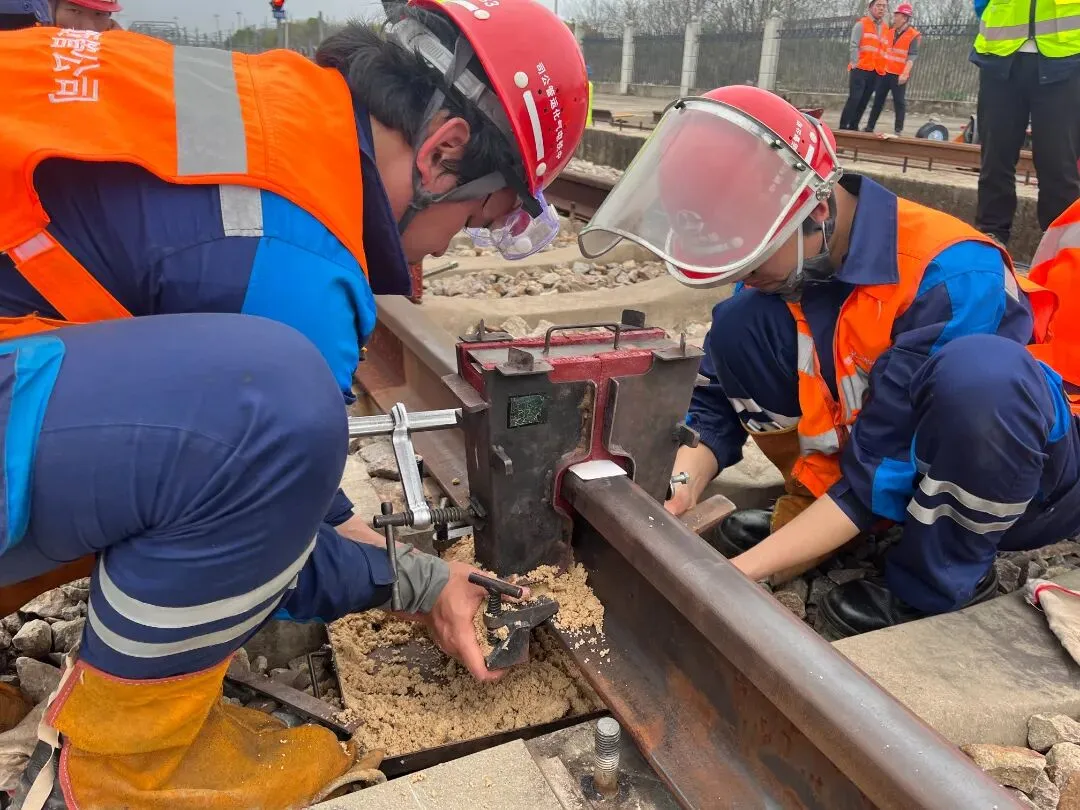 随后,作业人员对新旧钢轨焊接点进行全方位打磨除锈。通过精细打磨,确保焊接面光滑平整,为后续的高质量焊接奠定基础。