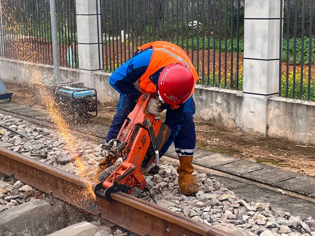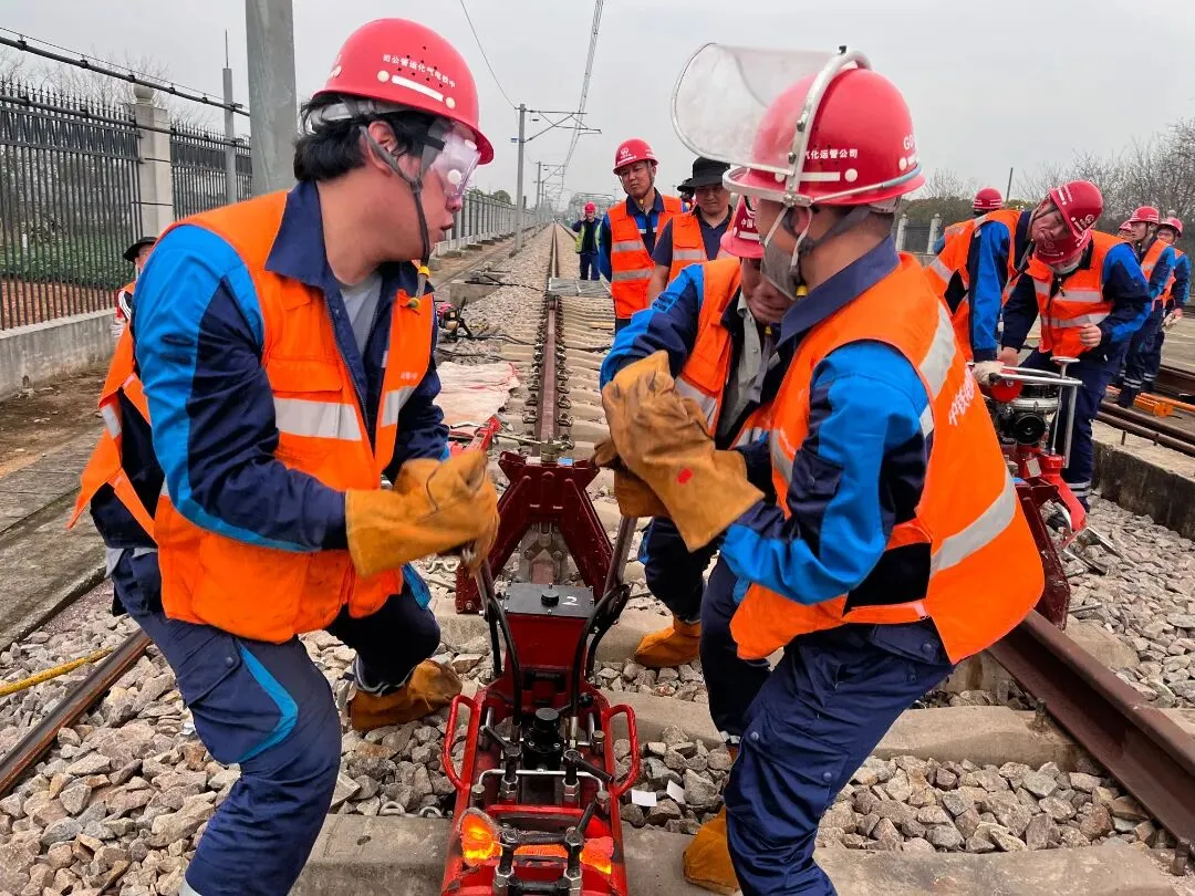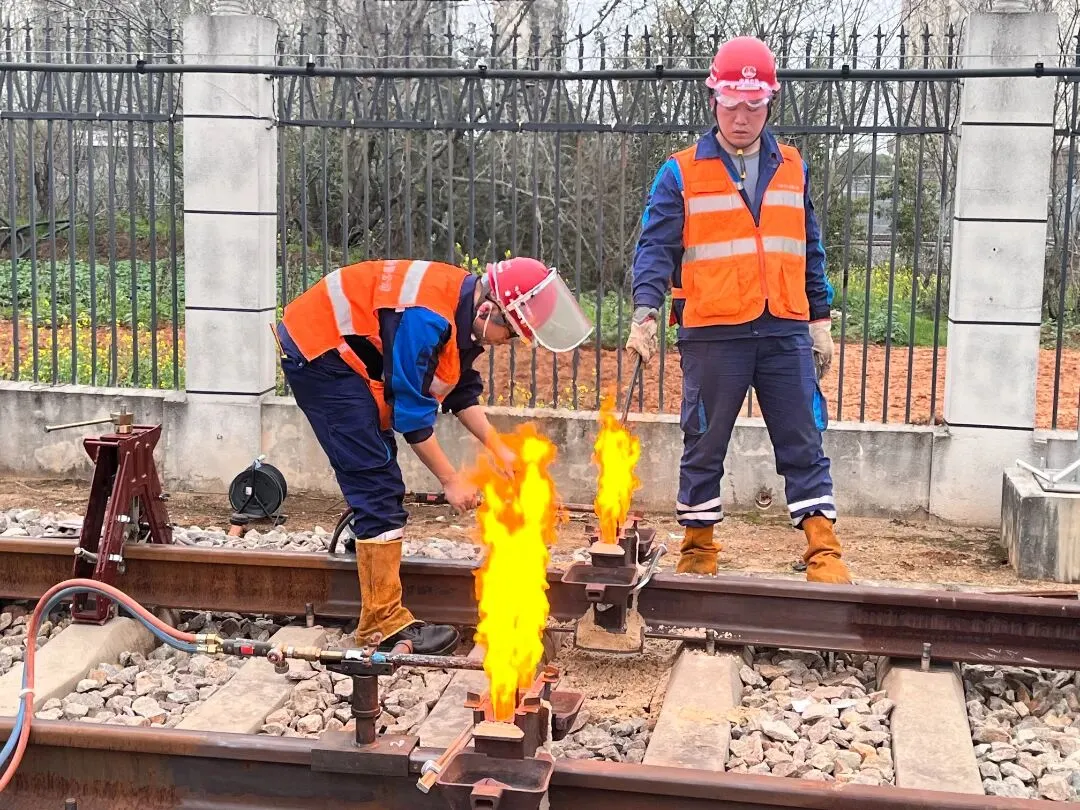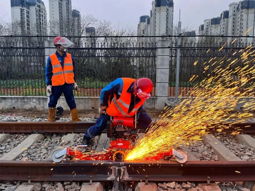 随后,作业人员对新旧钢轨焊接点进行全方位打磨除锈。通过精细打磨,确保焊接面光滑平整,为后续的高质量焊接奠定基础。