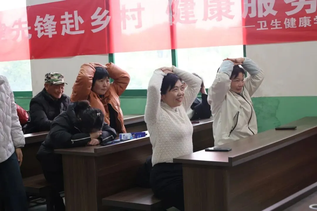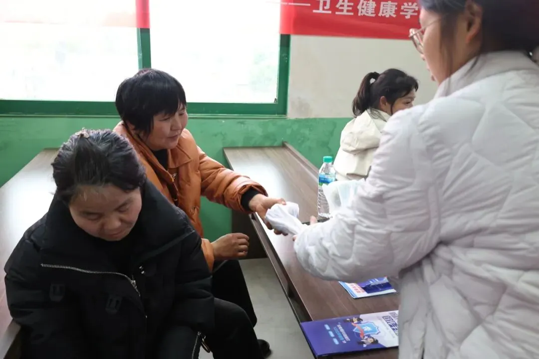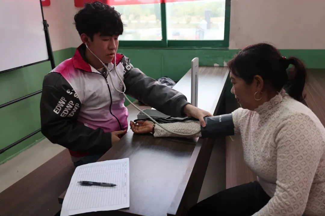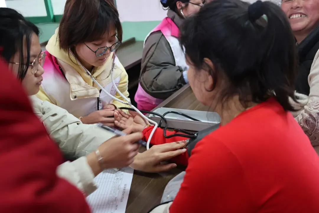 讲座正式开始前,志愿者们为到场的中年村民免费测量血压,细致记录血压数值。提前拉近和村民的距离,也把基础健康服务落到实处。