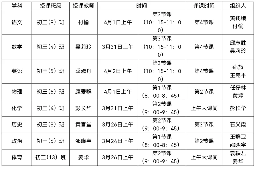 为扎实推进初三复习备考工作,提升复习课实效性,我校于3月下旬至4月初组织开展了初三复习研讨课活动。语文、数学、英语、物理、化学、历史、政治、体育八大学科依次登场,授课、听课、评课环环相扣,为备战中考汇聚集体智慧。