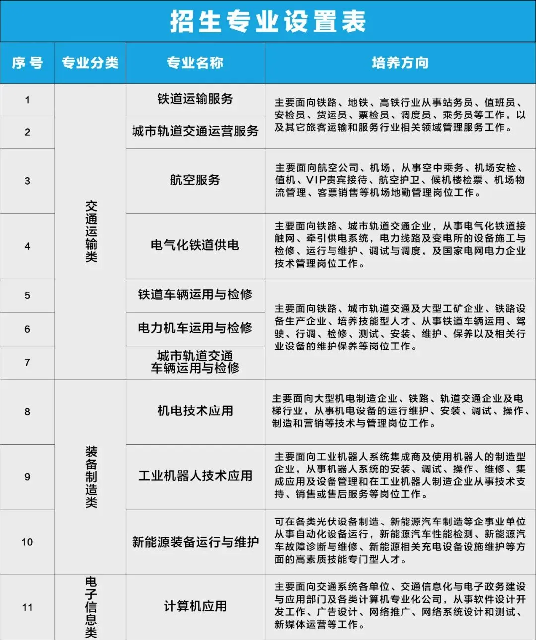 南昌向远轨道技术学校面向全国招生,培养铁路轨道交通行业火车/轨道车司机、乘务员、票务员、安检员、站务员、铁道供电、航空服务、工业机器人、机电技术应用、软件开发等专业人才。入学即签订就业协议,毕业后推荐就业!