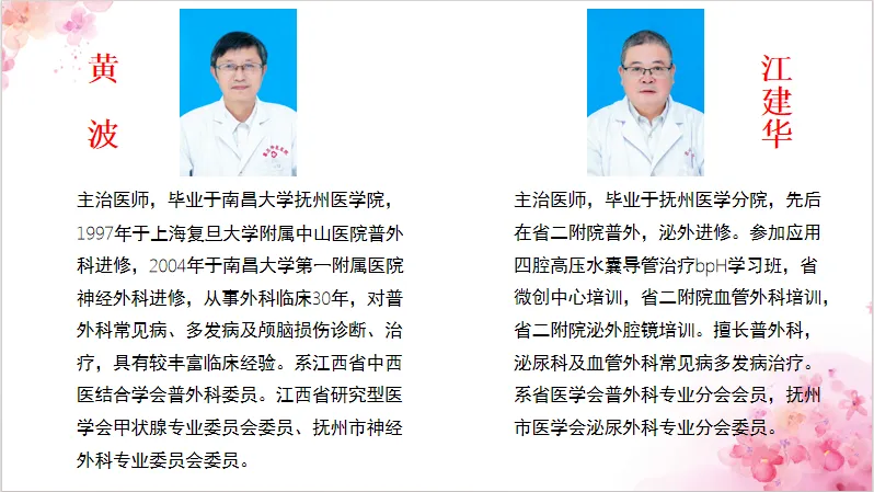 社会任职:江西省康复医学会外科快速康复分会 主任委员 江西省医师协会甲状腺外科医师分会 常务委员 江西省研究型医院甲状腺外科分会 常务委员 江西省科技专家库成员 《中国普通外科杂志》编委 中国医疗保健国际交流促进会甲状腺分会 青年委员 中国研究型医院学会甲状腺疾病专业委员会腔镜手术学组 全国委员 中国研究型医院学会甲状旁腺及骨代谢疾病专业委员会 全国委员