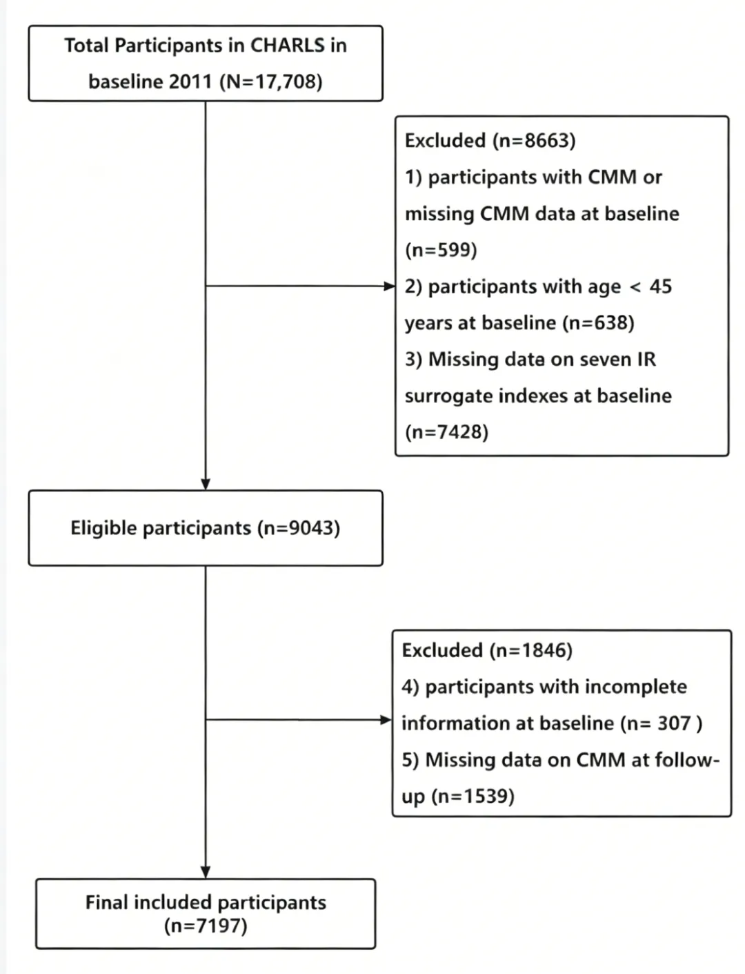 基于 CHARLS 队列,经多轮排除后最终纳入 7197 名研究对象,明确了研究样本的纳入与排除标准,保障了研究的代表性与可靠性。 图1:CHARLS 队列研究对象纳入与排除标准流程图