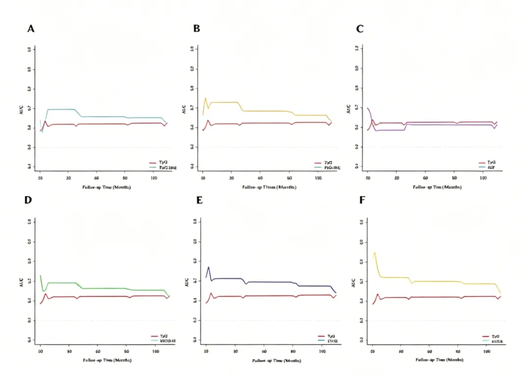 时间依赖 ROC 曲线证实,各 IR 指标对肌肉量减少的预测效能稳定,AUC 值在随访期内维持较高水平,具备良好的长期预测价值。