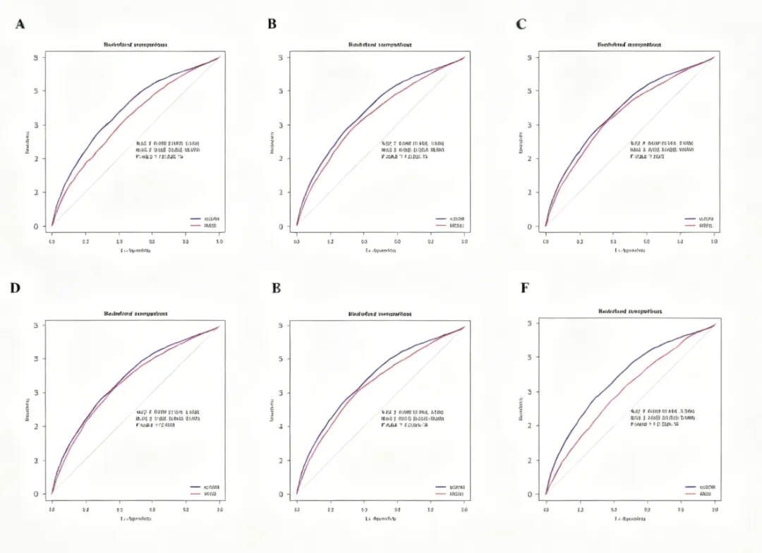 图5:胰岛素抵抗指标预测肌肉量减少的时间依赖 ROC 曲线预测模型的校准曲线显示,模型预测值与实际观测值拟合良好,区分度(AUC)优异,可精准预测肌肉量减少风险。