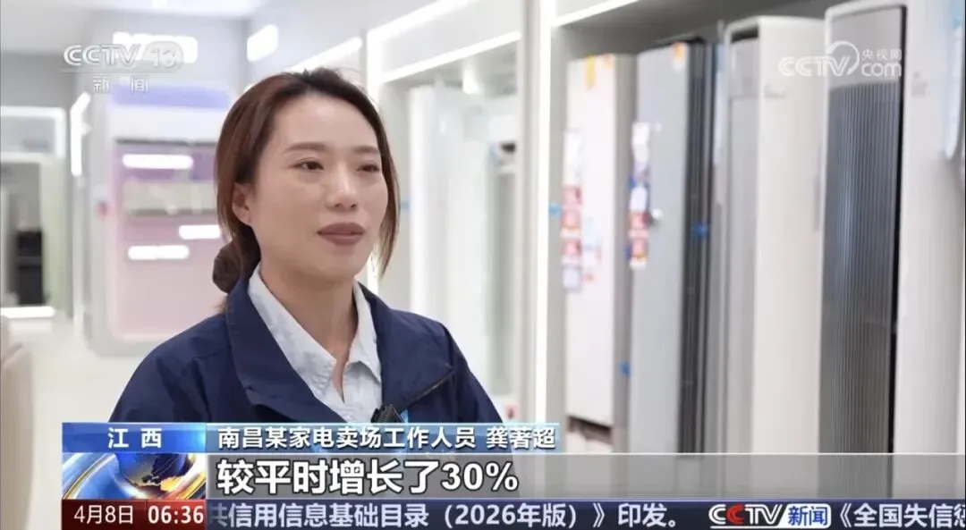 江西南昌某家电卖场工作人员龚著超介绍:“(近期)我们门店的客流量较平时增长了30%,销售额也提升了超25%,其中智能家电、绿色节能家电尤其受到消费者欢迎,销量占比也接近六成。”